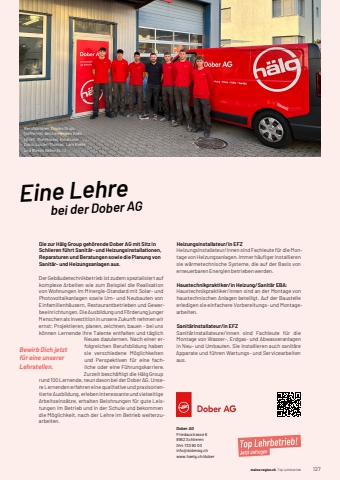 meine-region.ch meine-region.chTop Lehrbetriebe Top Lehrbetrieb 1271Dober AGFriedaustrasse 68952 Schlieren044 733 60 00info@doberag.chwww.haelg.ch/doberEine Lehre bei der Dober AGDie zur H%u00e4lg Group geh%u00f6rende Dober AG mit Sitz in Schlieren f%u00fchrt Sanit%u00e4r- und Heizungsinstallationen, Reparaturen und Beratungen sowie die Planung von Sanit%u00e4r- und Heizungsanlagen aus.Der Geb%u00e4udetechnikbetrieb ist zudem spezialisiert auf komplexe Arbeiten wie zum Beispiel die Realisation von Wohnungen im Minergie-Standard mit Solar- und Photovoltaikanlagen sowie Um- und Neubauten von Einfamilienh%u00e4usern, Restaurantbetrieben und Gewerbeeinrichtungen. Die Ausbildung und F%u00f6rderung junger Menschen als Investition in unsere Zukunft nehmen wir ernst: Projektieren, planen, zeichnen, bauen %u2013 bei uns k%u00f6nnen Lernende ihre Talente entfalten und t%u00e4glich Neues dazulernen. Nach einer erfolgreichen Berufsbildung haben sie verschiedene M%u00f6glichkeiten und Perspektiven f%u00fcr eine fachliche oder eine F%u00fchrungskarriere. Zurzeit besch%u00e4ftigt die H%u00e4lg Group rund 100 Lernende, neun davon bei der Dober AG. Unsere Lernenden erfahren eine qualitative und praxisorientierte Ausbildung, erleben interessante und vielseitige Arbeitseins%u00e4tze, erhalten Belohnungen f%u00fcr gute Leistungen im Betrieb und in der Schule und bekommen die M%u00f6glichkeit, nach der Lehre im Betrieb weiterzuarbeiten.Berufsbildner%u0009Zvonko%u0009Grujic%u0009(mitte) mit den Lernenden Enes Istrefi%u0009,%u0009Ron%u0009Hoxhaj,%u0009Emanuele%u0009Coco,%u0009Lucien%u0009Thomas,%u0009Lars%u0009Krebs%u0009und Bleron Selimi (v. l.)Heizungsinstallateur/in EFZHeizungsinstallateur/innen sind Fachleute f%u00fcr die Montage von Heizungsanlagen. Immer h%u00e4ufi ger installieren sie w%u00e4rmetechnische Systeme, die auf der Basis von erneuerbaren Energien betrieben werden. Haustechnikpraktiker/in Heizung/Sanit%u00e4r EBA:Haustechnikpraktiker/innen sind an der Montage von haustechnischen Anlagen beteiligt. Auf der Baustelle erledigen sie einfachere Vorbereitungs- und Montagearbeiten. Sanit%u00e4rinstallateur/in EFZSanit%u00e4rinstallateure/innen sind Fachleute f%u00fcr die Montage von Wasser-, Erdgas- und Abwasseranlagen in Neu- und Umbauten. Sie installieren auch sanit%u00e4re Apparate und f%u00fchren Wartungs- und Servicearbeiten aus.Bewirb Dich jetzt f%u00fcr eine unserer Lehrstellen.meine-region.ch Top Lehrbetriebe 1H%u00f6hn AGHerr Daniel GalantucciStallikonerstrasse 528903 Birmensdorf 044 730 07 44s.galantucci@maler-hoehn.chwww.maler-hoehn.chWir machen die Welt, wie sie Dir gef%u00e4llt!Ein modernes Malergesch%u00e4ft mit viel Erfahrung und einer langen Geschichte: In unserem gewachsenen Familienunternehmen sp%u00fcrt man den guten Geist eines pers%u00f6nlich gef%u00fchrten Unternehmens. Seien es unsere Kundinnen und Kunden, Partnerfi rmen oder unsere rund 20 Mitarbeiterinnen und Mitarbeiter: Bei uns steht der Mensch im Mittelpunkt.Das Maler-Handwerk mit all seinen vielf%u00e4ltigen Facet,ten ist seit Generationen unsere Passion. Mit viel Kom,petenz und Herzblut setzen wir uns jeden Tag daf%u00fcr ein, private oder auch berufl iche Umgebungen sch%u00f6ner und sicherer zu machen. Um dies zu gew%u00e4hrleisten, bauen wir auf eine erstklassige Ausbildung unseres Teams, eine klare und verl%u00e4ssliche Kommunikation und einen ganzheitlichen Blick auf jedes Projekt.Starte Deine Karriere mit unsDu bist motiviert, teamf%u00e4hig, kreativ und m%u00f6chtest einen Beruf erlernen, der Spass macht, nie langweilig wird und gute Karrierem%u00f6glichkeiten bietet? Du bist handwerklich geschickt, hast ein gutes r%u00e4umliches Vorstellungsverm%u00f6gen und einen Sinn f%u00fcr Formen und Farben? Dann bist du bei uns genau richtig.Maler/-in EFZ zu sein bedeutet eine grosse Vielf%u00e4ltig,keit im Berufsalltag. Nicht nur der Arbeitsort ist immer wieder neu, auch die Arbeit selbst ist sehr abwechs,lungsreich. Heute bemalst du Fassaden im Aussen,bereich, morgen im Innenbereich, W%u00e4nde, Decken und T%u00fcren mit Pinsel und Rollen oder du tapezierst Unter,gr%u00fcnde mit tollen Design-Tapeten. Am Ende des Tages siehst du, was du geschafft hast %u2013 ein tolles Ergebnis, das deine Kunden begeistert. Ziemlich cool, oder?Als Maler/-in erh%u00e4ltst du bei uns eine solide Berufsaus,bildung mit vielen Perspektiven, Weiterbildungs- und Karrierem%u00f6glichkeiten. F%u00fchlst du dich angesprochen und hast du Lust, Teil unseres grossartigen Teams zu werden? Dann w%u00fcrden wir dich gerne kennenlernen! Melde dich einfach bei uns!%u00abIST ES SCH%u00d6N, KOMMT%u2019S VON H%u00d6HN%u00bb