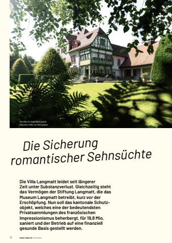 12 meine-region.ch meine-region.ch Gemeinden Die Sicherungromantischer Sehns%u00fcchteDie Villa Langmatt leidet seit l%u00e4ngerer Zeit unter Substanzverlust. Gleichzeitig steht das Verm%u00f6gen der Stiftung Langmatt, die das Museum Langmatt betreibt, kurz vor der Ersch%u00f6pfung. Nun soll das kantonale Schutzobjekt, welches eine der bedeutendsten Privatsammlungen des franz%u00f6sischen Impressionismus beherbergt, f%u00fcr 19,8 Mio. saniert und der Betrieb auf eine fi nanziell gesunde Basis gestellt werden. Die Villa im Jugendstil wurde zwischen 1899 und 1901 gebaut.