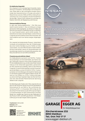 1 meine-region.ch Gemeinden meine-region.ch Gemeinden 13 Die Sicherungromantischer Sehns%u00fcchteDie Villa Langmatt leidet seit l%u00e4ngerer Zeit unter Substanzverlust. Gleichzeitig steht das Verm%u00f6gen der Stiftung Langmatt, die das Museum Langmatt betreibt, kurz vor der Ersch%u00f6pfung. Nun soll das kantonale Schutz,objekt, welches eine der bedeutendsten Privatsammlungen des franz%u00f6sischen Impressionismus beherbergt, f%u00fcr 19,8 Mio. saniert und der Betrieb auf eine fi nanziell gesunde Basis gestellt werden. Die Villa im Jugendstil wurde zwischen 1899 und 1901 gebaut.Ein idyllisches GegenbildDie Langmatt ist ein einzigartiges Ensemble, bestehend aus Architektur, Gartenanlage und Kunstsammlung. Diese z%u00e4hlt zu den wichtigsten privaten Sammlungen des Impressionismus in Europa und wurde im Wesentlichen zwischen 1908 und 1919 von Sidney Brown und seiner Frau Jenny angelegt, eine der Gr%u00fcnderfamilien der BBC. Heute ist die Langmatt ein wichtiger Ort Badener Identit%u00e4t, der Begegnung und Erholung.Partnerschaftliche PlanungEs gibt zwei Sanierungsbereiche: 1. Die Villa muss baulich saniert werden. 2. Das von Anfang an zu knapp bemessene Stiftungskapital, aus dessen Ertr%u00e4gen der Betrieb einschliesslich Geb%u00e4udeunterhalt zu bezahlen ist, muss fi nanziell saniert, sprich erh%u00f6ht werden. F%u00fcr beide Bereiche haben die Stadt Baden und die Stiftung Langmatt partnerschaftlich einen Plan entwickelt, der unter anderem auch vom Kanton Aargau mitgetragen wird.Die Langmatt als bedeutendes Museum, Industriekulturzeuge und wunderbares Haus der Entdeckungen, das einer breiten Bev%u00f6lkerung eine Vielfalt an Erlebnissen bietet, muss der %u00d6ffentlichkeit erhalten bleiben. Sie hat in den letzten Jahren mit Veranstaltungen und Ausstellungen deutlich an Attraktivit%u00e4t gewonnen, die Besucherzahl hat sich seit 2016 verdreifacht. Finanzierung und zeitlicher AblaufDie Geb%u00e4udesanierung kostet rund 19,8 Mio. Franken. Daran beteiligen sich die Stadt Baden, der Kanton Aargau, Stiftungen, Sponsor:innen sowie Privatpersonen. F%u00fcr die Geb%u00e4udesanierung und die zuk%u00fcnftige Instandhaltung ist die mittlerweile gegr%u00fcndete, gemeinn%u00fctzige Villa Langmatt AG zust%u00e4ndig. Daran ist die Stiftung Langmatt zu zwei Dritteln beteiligt und die Einwohnergemeinde Baden zu einem Drittel (mit 10 Mio. Franken; so leistet sie ihren Beitrag an die bauliche Sanierung). F%u00fcr die Sanierung des Stiftungsverm%u00f6gens soll der Verkauf von 1 bis 3 Bildern ca. 40 Mio. Franken einbringen, aus deren k%u00fcnftigen Kapitalertr%u00e4gen der Betrieb fi nanziert wird. Alle zentralen Meisterwerke der Sammlung bleiben in der Langmatt.Der Beteiligung der Stadt an der Villa Langmatt AG und damit an der baulichen Sanierung stimmte das Badener Stimmvolk am 18. Juni 2023 zu. Der Ja-Stimmen-Anteil betrug 79.25 %. Im November 2023 erfolgt der Bilderverkauf f%u00fcr die Sanierung des Stiftungsverm%u00f6gens in Zusammenarbeit mit dem Auktionshaus Christie%u2019s. Wegen der zweij %u00e4hrigen Sanierung des Geb%u00e4udes ist das Museum 2024 und 2025 geschlossen. Die Wiederer%u00f6ffnung ist f%u00fcr das Fr%u00fchjahr 2026 vorgesehen.Projektlaufzeit: 2021 bis 2026Baubeginn: 2024Kosten: 19,8 Mio. FrankenEngagieren Sie sich%u0009f%u00fcr%u0009die%u0009Zukunft%u0009der Langmatt. Spenden%u0009Sie%u0009jetzt!Inserat halbseitig, 101 x 297 mm