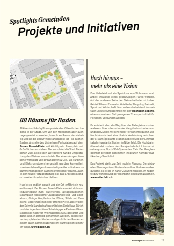 meine-region.ch meine-region.ch Gemeinden 151Spotlights Gemeinden Projekte und Initiativen88 B%u00e4ume f%u00fcr BadenPl%u00e4tze sind h%u00e4ufi g Brennpunkte des %u00f6ffentlichen Lebens in der Stadt. Um von den Menschen aber auch rege genutzt zu werden, braucht es Raum, der vielseitig und an die Bed%u00fcrfnisse angepasst ist - so auch in Baden. Anstelle des bisherigen Parkplatzes auf dem Brown Boveri-Platz soll k%u00fcnftig ein Eventplatz mit Gr%u00fcnfl %u00e4chen entstehen. Das entschied die Stadt Baden schon 2011, als sie den Wettbewerb f%u00fcr die Umgestaltung des Platzes ausschrieb. Der ehemals geschlossene Werkplatz von Brown Boveri & Cie., wo Turbinen und Elektromotoren hergestellt wurden, konvertiert zu einem lebendigen Innenstadtquartier mit einem zusammenh%u00e4ngenden System %u00f6ffentlicher R%u00e4ume. Auch in der neuen Platzgestaltung soll das Erbe des Standorts weiterhin erfahrbar bleiben.Nun ist es endlich soweit und der Ort erf%u00e4hrt ein neues Konzept. Der Brown Boveri-Platz wandelt sich vom Industrieplatz zum kultivierten, alltagstauglichen Baumplatz klassischer Auspr%u00e4gung (Feld- und Spitzahorn, Ginkgo, Hopfenbuche, F%u00f6hre, Stiel- und Zerreiche, Silberlinde) mit einer offenen Mitte. Das Projekt der Schmid Landschaftsarchitekten GmbH aus Z%u00fcrich und des Ingenieurb%u00fcros Scheidegger + Partner AG aus Baden soll noch vor Weihnachten 2023 gestartet und dann 2025 in Betrieb genommen werden. Tollen Konzerten, spielenden Kindern und gem%u00fctlichen Runden an einem lauen Sommerabend steht k%u00fcnftig nichts mehr im Wege. www.baden.chHoch hinaus %u2013 mehr als eine VisionDas Niderfeld soll ein Symbiose von Wohnraum und Arbeit inklusive eines grossz%u00fcgigen Parks werden. Auf der anderen Seite der Gleise befi ndet sich das Gebiet Silbern. Es vereint Hotellerie, Shopping, Freizeit, Sport und Wirtschaft. Nun sollen die beiden Limmattaler Entwicklungszentren mit der Hochbahn Silbern, einem von einem Seil gezogenen Transportmittel f%u00fcr Personen, verbunden werden. Es entsteht also ein Weg %u00fcber die Bahngleise %u2013 unter anderem %u00fcber die nationale Hauptbahnstrecke von und nach Z%u00fcrich mit sehr hoher Personenfrequenz. Die Hochbahn sichert eine direkte Verbindung zwischen der S-Bahn (geplante Station Silbern) und der Limmattalbahn (geplante Station im Niderfeld). Die Hochbahn %u00fcberwindet zudem den Rangierbahnhof Limmattal %u2013 eine grosse Nord-S%u00fcd-Sperre des Tals. Der Rangierbahnhof befi ndet sich mitten im gr%u00fcnen Korridor H%u00fcttikerberg-Sandb%u00fchl. Das Projekt steht zur Zeit noch in Planung. Den aktuellen Planungsstand fi nden sie online. Und wenn alles gutgeht, so ist es in naher Zukunft m%u00f6glich, im Niderfeld zu wohnen und per Hochbahn einkaufen zu gehen. www.niderfeld.chMANCHEK%u00d6NNENSUPERSHOPPEN,ANDERESUPERKOCHEN.GEWERBESTRASSE 24 CH-8800 THALWIL INF0@VISUALARTE.CH WWW.VISUALARTE.CHvisualart e %u00a92017LOGO Farben KUNDE Leonardo il gelato JOB Gestaltung Logo JOBNR. 9170922 PROJEKT LCGDATUM 5.August 2017 ANWENDUNG CCS Illustrator SCHRIFT Leonardo Grundlage / Cocomat Light P DESIGN Martin Eschmann il gelato Grundlage / Living Together antone Warm Gray 5 #a9a09b / CMYK 34%/31%/33%/10%Pantone 7527 UP / U #f0ebe0 / CMYK 3%/4%/11%/5%DAS ORIGINALA U S B E R L I NENTDECKENSIE DAS RIESIGEGASTRO ANGEBOT IMGR%u00d6SSTEN SCHWEIZERSHOPPINGCENTERHans im Gl%u00fcck undWonder Waffelauch sonntagsge%u00f6ffnet!230829 STM MAR Inserat_meine-region_A4.indd 1 30.08.2023 14:39:49