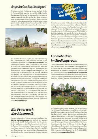162 meine-region.ch meine-region.ch GemeindenAngestrebte NachhaltigkeitFrontalunterricht, Hellraumprojektor und alle Kinder in Reih und Glied %u2013 das war einmal. Die 1962 erstellte Schulanlage Wolfsmatt ist altersbedingt umfassend sanierungsbed%u00fcrftig. Sie gen%u00fcgt den Anforderungen einer zeitgem%u00e4ssen Unterrichtsform nicht mehr und muss an geltende gesetzliche Anforderungen angepasst werden. Zudem bedarf es aufgrund der gestiegenen Sch%u00fclerzahlen einer baulichen Erweiterung. Die Dietiker Bev%u00f6lkerung hat per Volksabstimmung am 3. September 2023 dem Baukredit von %u00fcber 83 Mio. Franken zugestimmt. Das Projekt %u00abIm Gr%u00fcnen%u00bb des Generalplanerteams unter Federf%u00fchrung von B%u00fcnzli & Courvoisier Architekten AG zeichnet sich durch die gekonnte Auseinandersetzung und Erg%u00e4nzung mit der bestehenden schutzw%u00fcrdigen Schulanlage aus. Die Grundstruktur der Pavillonschule soll aber beibehalten werden. Die erforderlichen Erweiterungsbauten erg%u00e4nzen und integrieren das bestehende Ensemble gekonnt in s%u00fcdlicher Richtung. Entlang der markanten Gel%u00e4ndekante und damit parallel zur Vogelaustrasse situiert, bilden die Neubauten einen neuen zweiten und attraktiven Zugang zur Schulanlage. Die Nachhaltigkeit gilt w%u00e4hren der gesamten Konzeption als Leitthema: So ist unter anderem f%u00fcr die Neubauten eine Zertifi zierung gem%u00e4ss MINERGIE-P ECO vorgesehen. Der Baustart der ersten Etappe ist auf Sommer 2024, der Bezug der Neubauten auf Sommer 2026 geplant. Der Baustart der zweiten Etappe soll im Sommer 2026 erfolgen. Der Bezug der Bestandsbauten ist auf Sommer 2028 terminiert. www.dietikon.chEin Feuerwerk der Blasmusik Man soll bekanntlich Feste so feiern, wie sie fallen. Das Z%u00fcrcher Kantonalmusikfest f%u00e4llt 2024 auf das Wochenende vom 21. bis 23. Juni und fi ndet in den Gemeinden Urdorf und Schlieren statt. Musikbegeisterte treffen sich im Rahmen eines attraktiven Programms zum gemeinsamen Festerlebnis mit einzigartigen Highlights, vielf%u00e4ltigen Begegnungen und gegenseitigem Austausch. Jugendmusikvereine messen sich untereinander, ebenso Erwachsenenvereine %u2013 Unbeschwertheit und jugendliche Energie treffen auf gestandene, erfahrene Musizierende. Dank des modularen Aufbaus des Festreglements haben alle Vereine die M%u00f6glichkeit zur aktiven Teilnahme. Neu pr%u00e4sentieren die Teilnehmenden ein Pfl ichtst%u00fcck in der Unterhaltungs- wie auch in der Konzertmusik, eingebettet in ein selbst gestaltetes Programm. Eine hochkar%u00e4tige Jury verspricht eine Leistungsbeurteilung mit Mehrwert %u2013 garantiert auch eine Freude f%u00fcr die Ohren des Publikums. Das Organisationskomitee freut sich auf eine grosse Teilnahme bei ausgelassener Feststimmung und heisst Musikant:innen wie auch Zuh%u00f6rer:innen herzlich willkommen! www.zkmf2024.chF%u00fcr mehr Gr%u00fcn im SiedlungsraumLaut Bundesamt f%u00fcr Statistik leben in der Schweiz vier von f%u00fcnf Personen in der Stadt oder in der Agglomeration. Das heisst, im Alltag lebt die Schweizer Bev%u00f6lkerung mehrheitlich im dichten Siedlungsraum %u2013 gerade auch im Limmattal. Das Projekt %u00abGartenanlage Dunkelh%u00f6lzli%u00bbschafft im Naherholungsgebiet am Siedlungsrand von Z%u00fcrich-Altstetten eine neuartige Gartenanlage. Natur kann dort vor den Toren der Grossstadt erlebt werden. Im Dunkelh%u00f6lzli entstehen auf einer Fl%u00e4che von knapp vier Hektaren Familieng%u00e4rten, Land f%u00fcr gemeinschaftliches G%u00e4rtnern und ein parkartiger %u00f6ffentlicher Bereich. Das Dunkelh%u00f6lzli leistet damit einen wichtigen Beitrag zur Naherholung im Gr%u00fcnen. Mit den derzeitigen Zwischennutzungen durch die Vereine Gr%u00fcnh%u00f6lzli und Stadtrandacker sammeln Gartenbegeisterte bereits erste Erfahrungen im gemeinschaftlichen G%u00e4rtnern. Neu ist auch das Areal der G%u00e4rnterei mit den Glasgew%u00e4chsh%u00e4usern Bestandteil der Gesamtplanung. Das Baugesuch f%u00fcr das Gartenareal wurde im September 2022 eingereicht. Der Baustart ist f%u00fcr Fr%u00fchjahr 2024 vorgesehen. www.dunkelhoelzli.chEin Feuerwerkder Blasmusik!