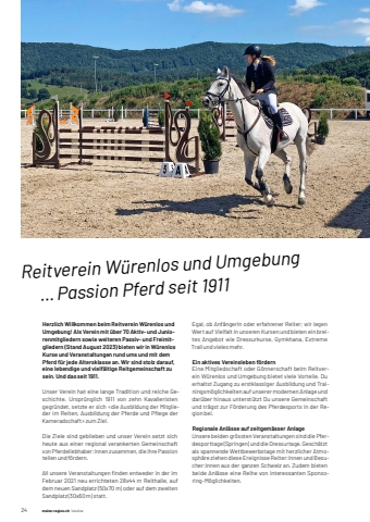 241 meine-region.ch meine-region.ch VereineReitverein W%u00fcrenlos und Umgebung %u2026 Passion Pferd seit 1911Herzlich Willkommen beim Reitverein W%u00fcrenlos und Umgebung! Als Verein mit %u00fcber 70 Aktiv- und Juniorenmitgliedern sowie weiteren Passiv- und Freimitgliedern (Stand August 2023) bieten wir in W%u00fcrenlos Kurse und Veranstaltungen rund ums und mit dem Pferd f%u00fcr jede Altersklasse an. Wir sind stolz darauf, eine lebendige und vielf%u00e4ltige Reitgemeinschaft zu sein. Und das seit 1911.Unser Verein hat eine lange Tradition und reiche Geschichte. Urspr%u00fcnglich 1911 von zehn Kavalleristen gegr%u00fcndet, setzte er sich %u00abdie Ausbildung der Mitglieder im Reiten, Ausbildung der Pferde und Pfl ege der Kameradschaft%u00bb zum Ziel.Die Ziele sind geblieben und unser Verein setzt sich heute aus einer regional verankerten Gemeinschaft von Pferdeliebhaber:innen zusammen, die ihre Passion teilen und f%u00f6rdern.All unsere Veranstaltungen fi nden entweder in der im Februar 2021 neu errichteten 28x44 m Reithalle, auf dem neuen Sandplatz (50x70 m) oder auf dem zweiten Sandplatz (30x60 m) statt.Egal, ob Anf%u00e4ngerin oder erfahrener Reiter; wir legen Wert auf Vielfalt in unseren Kursen und bieten ein breites Angebot wie Dressurkurse, Gymkhana, Extreme Trail und vieles mehr.Ein aktives Vereinsleben f%u00f6rdernEine Mitgliedschaft oder G%u00f6nnerschaft beim Reitverein W%u00fcrenlos und Umgebung bietet viele Vorteile. Du erhaltst Zugang zu erstklassiger Ausbildung und Trainingsm%u00f6glichkeiten auf unserer modernen Anlage und dar%u00fcber hinaus unterst%u00fctzt Du unsere Gemeinschaft und tr%u00e4gst zur F%u00f6rderung des Pferdesports in der Region bei.Regionale Anl%u00e4sse auf zeitgem%u00e4sser AnlageUnsere beiden gr%u00f6ssten Veranstaltungen sind die Pferdesporttage (Springen) und die Dressurtage. Gesch%u00e4tzt als spannende Wettbewerbstage mit herzlicher Atmosph%u00e4re ziehen diese Ereignisse Reiter:innen und Besucher:innen aus der ganzen Schweiz an. Zudem bieten beide Anl%u00e4sse eine Reihe von interessanten Sponsoring-M%u00f6glichkeiten.