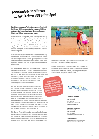 meine-region.ch meine-region.ch Vereine 391Tennisclub Schlieren %u2026 f%u00fcr jede:n das Richtige!Famili%u00e4re, erholsame Ferienstimmung im Tennisclub Schlieren %u2013 idyllisch eingebettet zwischen Feldern und nahe der Limmat gelegen, f%u00fchlen sich unsere G%u00e4ste und Spieler:innen rundum wohl.Sechs Aussen-Sandpl%u00e4tze, zwei Hallenpl%u00e4tze mit gelenkschonendem Belag, die professionelle Tennisschule mit Kursen f%u00fcr alle Altersstufen, Privat- oder Gruppenunterricht sowie spezifi sche Juniorenf%u00f6rderung und das gem%u00fctliche Clublokal mit seiner grossz%u00fcgigen Terrasse %u2013 im Tennisclub Schlieren steht die Freude am Sport, aber auch zielgerichtetes Training im Vordergrund.Der Tennisclub Schlieren bietet neben seiner ausgezeichneten Infrastruktur in professionellem Umfeld vor allem sportlichen Spass, geselliges Miteinander und generationen%u00fcbergreifendes Erleben einer tollen Sportart, welche Jung und Alt gleichermassen betreiben k%u00f6nnen.Ob Angestellte, Manager, Student:innen, Jugendliche oder Pensionierte %u2013 sie alle k%u00f6nnen im Tennisclub Schlieren w%u00e4hrend aller Jahreszeiten ihren Sport mit Kursen f%u00fcr alle Leistungs- und Altersstufen unter besten Bedingungen aus%u00fcben und in der Tennisschule mit international erfahrenen Tenniscoaches die Grundlagen erlernen oder ihre F%u00e4higkeiten vervollkommnen.%u00abIn der Tennisschule gehen wir individuell auf unsere Sch%u00fclerinnen und Sch%u00fcler ein%u00bb, erkl%u00e4rt Danny Freundlieb, Gr%u00fcnder der Tennisschule und einer der wenigen Schweizer Tennislehrer mit eidgen%u00f6ssischem Fachausweis. %u00abTennisneulinge erlernen die Grundlagen des Sports, werden dank der Tennisschule leicht in das Clubleben mit seinen gesellschaftlichen Anl%u00e4ssen integriert und fi nden gleichgesinnte Spielpartner:innen. Durch Turniere und andere Wettkampfformen wecken wir das Bed%u00fcrfnis und die Freude zum Sport, je nach Talent auch zum Leistungssport.%u00bbF%u00fcr Danny Freundlieb, selbst ehemaliger Schweizer Spitzenspieler, geht es in der Tennisschule nicht allein um Leistung: %u00abSport ist nicht nur gesund, er vermittelt auch viele gesellschaftlich relevante Werte. Wir setzen uns f%u00fcr diese Werte ein und sorgen daf%u00fcr, dass insbeTennisclub Schlieren Unterrohrweg%u00095/6%u00098952 Schlieren076 390 14 13kontakt@tcschlieren.chwww.tcschlieren.chRestaurant BreakpointUnterrohrweg%u000968952 Schlieren079 813 00 30info@restaurant-breakpoint.chVeranstaltungenAktuelle Termine entnehmen Sie bitte immer unserer Webseite.Breakpoint Unser hervorragendes Restaurant mit besonderer mediterraner und italienischer K%u00fcche ist immer einen Besuch wert.sondere Kinder und Jugendliche im Tennissport eine sinnvolle Freizeitbesch%u00e4ftigung fi nden.%u00bbDiverse kulinarische Anl%u00e4sse runden das Angebot ab. Nach dem Spiel verzaubert unser Clublokal Breakpoint seine G%u00e4ste mit feinen Pizzen, vielseitigen Mittagsmen%u00fcs und einer ausgezeichneten Karte.