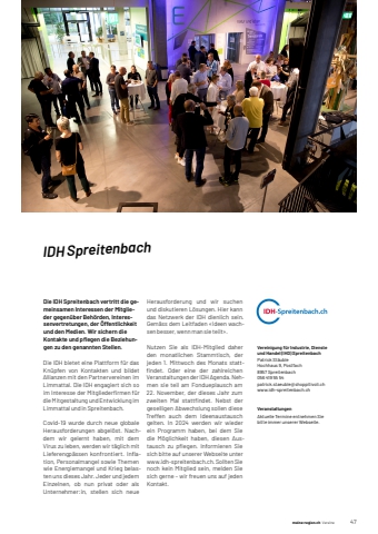 meine-region.ch meine-region.ch Vereine 471IDH SpreitenbachDie IDH Spreitenbach vertritt die gemeinsamen Interessen der Mitglieder gegen%u00fcber Beh%u00f6rden, Interessenvertretungen, der %u00d6ffentlichkeit und den Medien. Wir sichern die Kontakte und pfl egen die Beziehungen zu den genannten Stellen.Die IDH bietet eine Plattform f%u00fcr das Kn%u00fcpfen von Kontakten und bildet Allianzen mit den Partnervereinen im Limmattal. Die IDH engagiert sich so im Interesse der Mitgliederfi rmen f%u00fcr die Mitgestaltung und Entwicklung im Limmattal und in Spreitenbach.Covid-19 wurde durch neue globale Herausforderungen abgel%u00f6st. Nachdem wir gelernt haben, mit dem Virus zu leben, werden wir t%u00e4glich mit Lieferengp%u00e4ssen konfrontiert. Infl ation, Personalmangel sowie Themen wie Energiemangel und Krieg belasten uns dieses Jahr. Jeder und jedem Einzelnen, ob nun privat oder als Unternehmer:in, stellen sich neue Herausforderung und wir suchen und diskutieren L%u00f6sungen. Hier kann das Netzwerk der IDH dienlich sein. Gem%u00e4ss dem Leitfaden %u00abIdeen wachsen besser, wenn man sie teilt%u00bb. Nutzen Sie als IDH-Mitglied daher den monatlichen Stammtisch, der jeden 1. Mittwoch des Monats stattfi ndet. Oder eine der zahlreichen Veranstaltungen der IDH Agenda. Nehmen sie teil am Fondueplausch am 22. November, der dieses Jahr zum zweiten Mal stattfi ndet. Nebst der geselligen Abwechslung sollen diese Treffen auch dem Ideenaustausch gelten. In 2024 werden wir wieder ein Programm haben, bei dem Sie die M%u00f6glichkeit haben, diesen Austausch zu pfl egen. Informieren Sie sich bitte auf unserer Webseite unter www.idh-spreitenbach.ch. Sollten Sie noch kein Mitglied sein, melden Sie sich gerne %u2013 wir freuen uns auf jeden Kontakt.Vereinigung f%u00fcr Industrie, Dienste und Handel (IHD) SpreitenbachPatrick St%u00e4ubleHochhaus 9, Postfach8957 Spreitenbach056 419 55 54patrick.staeuble@shoppitivoli.chwww.idh-spreitenbach.chVeranstaltungenAktuelle Termine entnehmen Sie bitte immer unserer Webseite.Gerald Barcal Automobile AGFarbhofstrasse 21, 8048 Z%u00fcrichTel. 044 492 56 56, barcalauto@bluewin.chpartner.volkswagen.ch/gerald-barcal-automobile/deWir sind Ihr Partner f%u00fcr Reparatur und Service.Volkswagen ServiceIhr Volkswagen-Partnerin AltstettenIhr Volkswagen-Partner in Altstetten39013_TE_Inserat_Swiss-Interpublic AG_v2.indd 1 27.09.23 15:56Gerald Barcal Automobile AGFarbhofstrasse 21, 8048 Z%u00fcrichTel. 044 492 56 56, barcalauto@bluewin.chpartner.volkswagen.ch/gerald-barcal-automobile/deWir sind Ihr Partner f%u00fcr Reparatur und Service.Volkswagen ServiceIhr Volkswagen-Partnerin AltstettenIhr Volkswagen-Partner in Altstetten27.09.23 15:56 39013_TE_Inserat_Swiss-Interpublic AG_v2.indd 1Gerald Barcal Automobile AGFarbhofstrasse 21, 8048 Z%u00fcrichTel. 044 492 56 56, barcalauto@bluewin.chpartner.volkswagen.ch/gerald-barcal-automobile/deWir sind Ihr Partner f%u00fcr Reparatur und Service.Volkswagen ServiceIhr Volkswagen-Partnerin AltstettenIhr Volkswagen-Partner in Altstetten27.09.23 15:56 39013_TE_Inserat_Swiss-Interpublic AG_v2.indd 1