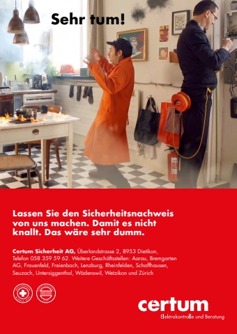 48 meine-region.ch VereineLassen Sie den Sicherheitsnachweis von uns machen. Damit es nicht knallt. Das w%u00e4re sehr dumm.Certum Sicherheit AG, %u00dcberlandstrasse 2, 8953 Dietikon, Telefon 058 359 59 62. Weitere Gesch%u00e4ftsstellen: Aarau, Bremgarten AG, Frauenfeld, Freienbach, Lenzburg, Rheinfelden, Schaffhausen, Seuzach, Untersiggenthal, W%u00e4denswil, Wetzikon und Z%u00fcrichSehr tum!