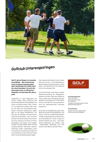 meine-region.ch meine-region.ch Vereine 491Golfclub UnterengstringenSeit 21 Jahren fl iegen im Limmattal die Golfb%u00e4lle... Wer einmal erfolgreich mit diesem faszinierenden Sport angefangen hat, bleibt meist ein Leben lang dabei. So reicht die Altersspanne der ca. 390 aktiven Mitglieder von 6 bis %u00fcber 90 Lebensjahre.Organisiert in f%u00fcnf Sektionen (Junioren, Ladies, Men%u2018s, Senioren und Gesamtclub) d%u00fcrfen die Mitglieder auf einem wundersch%u00f6nen Platz, mitten im Limmattal frei spielen oder auch an den %u00fcber 50 verschiedenen j%u00e4hrlichen Turnieren teilnehmen. Dabei gibt es die ganze Bandbreite: von den sehr ernsthaften, voll sportlichen Clubmeisterschaften, den verschiedensten einzelnen Sektionsturnieren bis hin zu Plausch-Turnieren mit dem Hauptfokus auf Spass. Auch gegenseitige Freundschaftstreffen mit den entsprechenden Sektionen anderer Golfclubs fi nden regelm%u00e4ssig statt. Und nat%u00fcrlich ist Unterengstringen mit verschiedenen Teams bei den Swiss Golf/ Interclub Wettbewerben dabei.Das Gesellschaftsleben kommt ebenfalls nicht zu kurz %u2013 auch dank des ausgezeichneten Clubrestaurants %u00abNineteen%u00bb, das %u00f6ffentlich ist. Ein Besuch lohnt sich auf jeden Fall!F%u00fcr den Einstieg in den Sport und die Weiterentwicklung der F%u00e4higkeiten arbeiten auf dem Platz drei Golfl ehrer und es steht eine vielseitige %u00dcbungsanlage zur Verf%u00fcgung. F%u00fcr den Nachwuchs unterh%u00e4lt die Juniorensektion auch ein systematisches Trainingsprogramm.Wo fr%u00fcher ein Salatfeld war, lebt heute dank der grossen Biotopfl %u00e4chen, der Teiche und der wiederhergestellten fr%u00fcheren Bachl%u00e4ufe eine faszinierende Artenvielfalt an Tieren. Sogar ein weiterer Bieber hat sich %u2013 nach dem ersten Biberpaar von letztem Jahr %u2013 angesiedelt, allerdings zum Leidwesen vieler B%u00e4ume auf dem Platz%u2026Golf Unterengstringen In den Schanzen 1 8103%u0009Unterengstringen044 733 55 44info@golf-unterengstringen.ch www.golfunterengstringen.chVeranstaltungenAktuelle Termine entnehmen Sie bitte immer unserer Webseite.Lassen Sie den Sicherheitsnachweis von uns machen. Damit es nicht knallt. Das w%u00e4re sehr dumm.Certum Sicherheit AG, %u00dcberlandstrasse 2, 8953 Dietikon, Telefon 058 359 59 62. Weitere Gesch%u00e4ftsstellen: Aarau, Bremgarten AG, Frauenfeld, Freienbach, Lenzburg, Rheinfelden, Schaffhausen, Seuzach, Untersiggenthal, W%u00e4denswil, Wetzikon und Z%u00fcrichSehr tum!