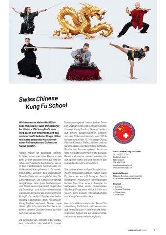 meine-region.ch meine-region.ch Vereine 571Swiss Chinese Kung Fu SchoolWir bieten eine kleine Wohlf%u00fchloase mit einem Touch chinesischer Architektur. Die Kung Fu-Schule wird durch den erfahrenen und top motivierten Schulleiter Roger M%u00fcller mit einem gesunden Mix chinesischer Philosophie und Schweizer Kultur gef%u00fchrt.Roger M%u00fcller ist bestrebt, seinen Sch%u00fcler:innen stets das Beste zu geben: Er legt grossen Wert auf eine seri%u00f6se und fundierte Ausbildung, sei es in den traditionellen Formen oder im Vollkontakt-Kampfbereich. Er ist ein ordinierter Sch%u00fcler des legend%u00e4ren Shaolin-Tempels und geh%u00f6rt der 34. Generation an. Der Schulleiter pfl egt langj %u00e4hrige, sehr gute Beziehungen mit China und organisiert regelm%u00e4ssig Trainings- und Kulturreisen in das Land des L%u00e4chelns. Die Swiss Chinese Kung Fu School ist Mitglied der Swiss Wushu Federation, dem nationalen Kung Fu-Dachverband. Dieser organisiert j%u00e4hrlich mehrere Turniere, an denen unsere Sch%u00fcler:innen ihr K%u00f6nnen messen k%u00f6nnen.Ob jung oder alt, schlank oder korpulent, m%u00e4nnlich oder weiblich: Unser Trainingsangebot kennt keine Grenzen und kann von allen genutzt werden. Unsere Kung Fu-Ausbildung basiert auf einem ausgekl%u00fcgelten System von drei Stilen und besteht aus 12 Pr%u00fcfungen und einer 13. Meisterpr%u00fcfung. Mit viel Einsatz, Fleiss, Willen und nat%u00fcrlich Spass werden Kicks, Schl%u00e4ge, Blocks und Formen gelernt. Auch unsere Kleinsten kommen nicht zu kurz: Bereits ab sechs Jahren werden sie auf spielerische Art und Weise in die Kunst des Kung Fu eingef%u00fchrt.Sie suchen einen ruhigen Ausgleich zu Ihrem stressigen Alltag? Neben Kung Fu bieten wir auch Qi Gong an: Durch langsame, meditative Bewegungen lernen Sie, Ihre innere Energie zu aktivieren. Oder unser powervolles Workout-Programm %u00abKick it fi t!%u00bb mit vielen, sehr coolen Fitness%u00fcbungen und Kampfkunst-Kombos .Herzlich willkommen in der Swiss Chinese Kung Fu School %u2013 wir freuen uns auf Ihren Besuch! Viele weitere Informationen fi nden Sie auf unserer Webseite unter www.swisskungfu.ch.Swiss Chinese Kung Fu School%u745e%u58eb%u4e2d%u56fd%u6b66 %u5b66%u6821 Grubenstrasse 48902%u0009Urdorf076 525 37 48info@swisskungfu.ch www.swisskungfu.chVeranstaltungenAktuelle Termine entnehmen Sie bitte immer unserer Webseite.Angebot%u2022 Training%u2022 Personal Training%u2022 Chinareisen%u2022 Showteam