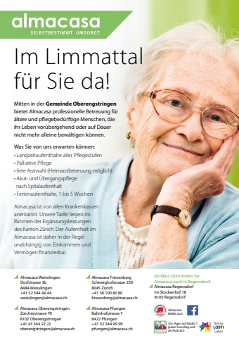 58 meine-region.ch VereineAlmacasa Weisslingen Dorfstrasse 3b8484 Weisslingen+41 52 544 44 44weisslingen@almacasa.chAlmacasa Oberengstringen Z%u00fcrcherstrasse 708102 Oberengstringen +41 43 544 22 22oberengstringen@almacasa.chAlmacasa Friesenberg Schweighofstrasse 2308045 Z%u00fcrich+41 58 100 80 80friesenberg@almacasa.chAlmacasa Pfungen Bahnhofstrasse 78422 Pfungen+41 52 544 99 99pfungen@almacasa.chAlmacasa bildet aus!%u00abDr. Age%u00bb auf Radio 1 jeden Sonntag und als Podcast!Im Limmattal f%u00fcr Sie da!Ab M%u00e4rz 2024 fi nden Sie Almacasa auch in Regensdorf!Almacasa RegensdorfIm Stockenhof 188105 RegensdorfMitten in der Gemeinde Oberengstringenbietet Almacasa professionelle Betreuung f%u00fcr %u00e4ltere und pfi egebed%u00fcrftige Menschen, die ihr Leben vor%u00fcbergehend oder auf Dauer nicht mehr alleine bew%u00e4ltigen k%u00f6nnen.Was Sie von uns erwarten k%u00f6nnen:%u2022 Langzeitaufenthalte aller Pfl egestufen%u2022 Palliative Pfl ege%u2022 freie Arztwahl (Heimarztbetreuung m%u00f6glich)%u2022 Akut- und %u00dcbergangspfl egenach Spitalaufenthalt%u2022 Ferienaufenthalte, 1 bis 5 WochenAlmacasa ist von allen Krankenkassen anerkannt. Unsere Tarife liegen im Rahmen der Erg%u00e4nzungsleistungen des Kanton Z%u00fcrich. Der Aufenthalt im Almacasa ist daher in der Regel unabh%u00e4ngig von Einkommen und Verm%u00f6gen fi nanzierbar.