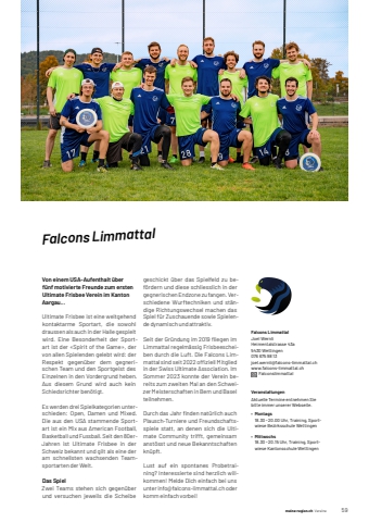 meine-region.ch meine-region.ch Vereine 591Falcons Limmattal Von einem USA-Aufenthalt %u00fcber f%u00fcnf motivierte Freunde zum ersten Ultimate Frisbee Verein im Kanton Aargau...Ultimate Frisbee ist eine weitgehend kontaktarme Sportart, die sowohl draussen als auch in der Halle gespielt wird. Eine Besonderheit der Sportart ist der %u00abSpirit of the Game%u00bb, der von allen Spielenden gelebt wird: der Respekt gegen%u00fcber dem gegnerischen Team und den Sportgeist des Einzelnen in den Vordergrund heben. Aus diesem Grund wird auch kein Schiedsrichter ben%u00f6tigt. Es werden drei Spielkategorien unterschieden: Open, Damen und Mixed. Die aus den USA stammende Sportart ist ein Mix aus American Football, Basketball und Fussball. Seit den 80erJahren ist Ultimate Frisbee in der Schweiz bekannt und gilt als eine der am schnellsten wachsenden Teamsportarten der Welt. Das SpielZwei Teams stehen sich gegen%u00fcber und versuchen jeweils die Scheibe geschickt %u00fcber das Spielfeld zu bef%u00f6rdern und diese schliesslich in der gegnerischen Endzone zu fangen. Verschiedene Wurftechniken und st%u00e4ndige Richtungswechsel machen das Spiel f%u00fcr Zuschauende sowie Spielende dynamisch und attraktiv. Seit der Gr%u00fcndung im 2019 fl iegen im Limmattal regelm%u00e4ssig Frisbeescheiben durch die Luft. Die Falcons Limmattal sind seit 2022 offi ziell Mitglied in der Swiss Ultimate Association. Im Sommer 2023 konnte der Verein bereits zum zweiten Mal an den Schweizer Meisterschaften in Bern und Basel teilnehmen. Durch das Jahr fi nden nat%u00fcrlich auch Plausch-Turniere und Freundschaftsspiele statt, an denen sich die Ultimate Community trifft, gemeinsam anst%u00f6sst und neue Bekanntschaften kn%u00fcpft. Lust auf ein spontanes Probetraining? Interessierte sind herzlich willkommen! Melde Dich einfach bei uns unter info@falcons-limmattal.ch oder komm einfach vorbei!Falcons LimmattalJoel WernliHeimentalstrasse 43a5430 Wettingen076 675 98 13joel.wernli@falcons-limmattal.chwww.falcons-limmattal.ch FalconslimmattalVeranstaltungenAktuelle Termine entnehmen Sie bitte immer unserer Webseite.%u2022 Montags18.30%u0009%u2013%u000920.00%u0009Uhr,%u0009Training,%u0009Sportwiese Bezirksschule Wettingen%u2022 Mittwochs18.30%u0009%u2013%u000920.15%u0009Uhr,%u0009Training,%u0009Sportwiese%u0009Kantonsschule%u0009Wettingen
