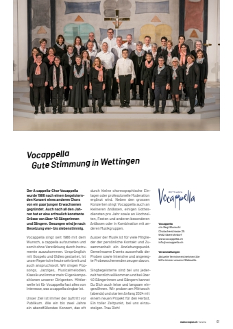meine-region.ch meine-region.ch Vereine 61Vocappella Gute Stimmung in WettingenDer A cappella-Chor Vocappella wurde 1986 nach einem begeisternden Konzert eines anderen Chors von ein paar jungen Erwachsenen gegr%u00fcndet. Auch nach all den Jahren hat er eine erfreulich konstante Gr%u00f6sse von %u00fcber 40 S%u00e4ngerinnen und S%u00e4ngern. Gesungen wird je nach Besetzung vier- bis siebenstimmig.Vocappella singt seit 1986 mit dem Wunsch, a cappella aufzutreten und somit ohne Verst%u00e4rkung durch Instrumente auszukommen. Urspr%u00fcnglich mit Gospels und Oldies gestartet, ist unser Repertoire heute sehr breit und auch anspruchsvoll. Wir singen Popsongs, Jazziges, Musicalmelodien, Klassik und immer mehr Eigenkompositionen unserer Dirigenten. Mittlerweile ist f%u00fcr Vocappella fast alles von Interesse, was a cappella singbar ist. Unser Ziel ist immer der Auftritt vor Publikum. Alle ein bis zwei Jahre ein abendf%u00fcllendes Konzert, das oft durch kleine choreographische Einlagen oder professionelle Moderation erg%u00e4nzt wird. Neben den grossen Konzerten singt Vocappella auch an kleineren Anl%u00e4ssen, einigen Gottesdiensten pro Jahr sowie an Hochzeiten, Festen und anderen besonderen Anl%u00e4ssen oder in Kombination mit anderen Musikgruppen.Ausser der Musik ist f%u00fcr viele Mitglieder der pers%u00f6nliche Kontakt und Zusammenhalt ein Anziehungspunkt. Gemeinsame Events ausserhalb der Proben sowie intensive und angeregte Probewochenenden zeugen davon. Singbegeisterte sind bei uns jederzeit herzlich willkommen und bei %u00fcber 40 S%u00e4ngerinnen und S%u00e4ngern kannst Du Dich auch leise und langsam eingew%u00f6hnen. Wir proben am Mittwoch (abends) und starten Anfang 2024 mit einem neuen Projekt f%u00fcr den Herbst. Ein toller Zeitpunkt, bei uns einzusteigen. Trau Dich!Vocappellac/o%u0009Regi%u0009BlunschiCholacherstrasse%u0009355452 Oberrohrdorfwww.vocappella.ch info@vocappella.chVeranstaltungenAktuelle Termine entnehmen Sie bitte immer unserer Webseite.