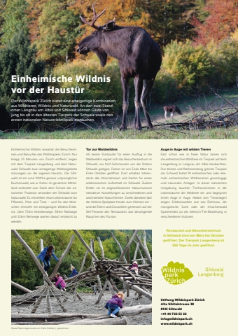 62 meine-region.ch VereineEinheimische Wildnis erwartet die Besucherinnen und Besucher des Wildnisparks Z%u00fcrich. Nur knapp 25 Minuten von Z%u00fcrich entfernt, liegen mit dem Tierpark Langenberg und dem Naturwald Sihlwald zwei einzigartige Wildnisgebiete sozusagen vor der eigenen Haust%u00fcr. Der Sihlwald ist ein rund 1100ffha grosser urspr%u00fcnglicher Buchenwald, wie er fr%u00fcher im gesamten Mittelland verbreitet war. Dank dem Schutz der nat%u00fcrlichen Prozesse verwildert der Sihlwald zum Naturwald. Es entstehen neue Lebensr%u00e4ume f%u00fcr Pfl anzen, Pilze und Tiere %u2013 und f%u00fcr den Men,schen entsteht ein einzigartiges Wildnis-Erleb,nis. %u00dcber 72ffkm Wanderwege, 58ffkm Radwege und 52ffkm Reitwege warten darauf, entdeckt zu werden.Tor zur WaldwildnisAls bester Startpunkt f%u00fcr einen Ausfl ug in die Waldwildnis eignet sich das Besucherzentrum in Sihlwald, nur f%u00fcnf Gehminuten von der Station Sihlwald gelegen. Dieses ist von Ende M%u00e4rz bis Ende Oktober ge%u00f6ff net. Dort erhalten Interessierte alle Informationen und Karten f%u00fcr einen erlebnisreichen Aufenthalt im Sihlwald. Zudem fi nden sie im angeschlossenen Naturmuseum interaktive Ausstellungen zu verschiedenen und wechselnden Naturthemen. Direkt daneben l%u00e4dt der Wildnis-Spielplatz Kinder zum Klettern ein %u2013 und die Eltern und Grosseltern geniessen auf der Sihl-Terrasse des Restaurants das beruhigende Rauschen des Flusses. Auge in Auge mit wilden TierenFast schon wie in freier Natur lassen sich die einheimischen Wildtiere im Tierpark auf dem Langenberg in Langnau am Albis beobachten. Der %u00e4lteste und fl %u00e4chenm%u00e4ssig gr%u00f6sste Tierpark der Schweiz bietet 19 einheimischen oder ehemals einheimischen Wildtierarten gross z%u00fcgige und naturnahe Anlagen. In dieser nat%u00fcrlichen Umgebung tauchen Tierfreund:innen in die Lebensr%u00e4ume der Wildtiere ein und begegnen ihnen Auge in Auge. Neben den Tieranlagen zeigen Erlebniswelten wie das Elchhaus, die mongolische Jurte oder der Knochenwald Spannendes zu der Mensch-Tier-Beziehung in verschiedenen Kulturen.Restaurant und Besucherzentrum in Sihlwald sind von M%u00e4rz bis Oktober ge%u00f6ffnet. Der Tierpark Langenberg ist 365 Tage im Jahr ge%u00f6ffnet.Stiftung Wildnispark Z%u00fcrichAlte Sihltalstrasse 388135 Sihlwald+41 44 722 55 22info@wildnispark.chwww.wildnispark.chDiese Reportage wurde von Hans Koblet jr. gesponsert.Der Wildnispark Z%u00fcrich bietet eine einzigartige Kombination aus Wildtieren, Wildnis und Naturwald. An den zwei Standorten Langnau am Albis und Sihlwald k%u00f6nnen G%u00e4ste von jung bis alt in den %u00e4ltesten Tierpark der Schweiz sowie den ersten nationalen Natur erlebnispark eintauchen.Einheimische Wildnis vor der Haust%u00fcr