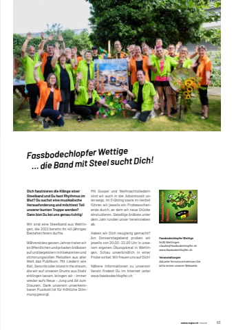 meine-region.ch meine-region.ch Vereine 631Fassbodechlopfer Wettige %u2026 die Band mit Steel sucht Dich! Dich faszinieren die Kl%u00e4nge einer Steelband und Du hast Rhythmus im Blut? Du suchst eine musikalische Herausforderung und m%u00f6chtest Teil unserer bunten Truppe werden? Dann bist Du bei uns genau richtig!Wir sind eine Steelband aus Wettingen, die 2022 bereits ihr 40-j%u00e4hriges Bestehen feiern durfte. W%u00e4hrend des ganzen Jahres treten wir an %u00f6ffentlichen und privaten Anl%u00e4ssen auf und begeistern mit bekannten und stimmungsvollen Melodien aus aller Welt das Publikum. Mit Liedern wie Bali, Senorita oder Island in the stream, die wir auf unseren Drums aus Stahl erklingen lassen, bringen wir - immer wieder aufs Neue %u2013 Jung und Alt zum Staunen. Dank unserem unverkennbaren Musikstil ist f%u00fcr fr%u00f6hliche Stimmung gesorgt.Mit Gospel und Weihnachtsliedern sind wir auch in der Adventszeit unterwegs. Im Fr%u00fchling sowie im Herbst f%u00fchren wir jeweils ein Probewochenende durch, an dem wir neue St%u00fccke einstudieren. Gesellige Anl%u00e4sse unter dem Jahr runden unser Vereinsleben ab. Haben wir Dich neugierig gemacht? Am Donnerstagabend proben wir jeweils von 20.00 - 22.00 Uhr in unserem eigenen %u00dcbungslokal in Wettingen. Schau unverbindlich in einer Probe vorbei. Wir freuen uns auf Dich!N%u00e4here Informationen zu unserem Verein fi ndest Du im Internet unter www.fassbodechlopfer.chFassbodechlopfer Wettige 5430 Wettingenclaudia@fassbodechlopfer.chwww.fassbodechlopfer.chVeranstaltungenAktuelle Termine entnehmen Sie bitte immer unserer Webseite.Einheimische Wildnis erwartet die Besucherinnen und Besucher des Wildnisparks Z%u00fcrich. Nur knapp 25 Minuten von Z%u00fcrich entfernt, liegen mit dem Tierpark Langenberg und dem Naturwald Sihlwald zwei einzigartige Wildnisgebiete sozusagen vor der eigenen Haust%u00fcr. Der Sihlwald ist ein rund 1100ffha grosser urspr%u00fcnglicher Buchenwald, wie er fr%u00fcher im gesamten Mittelland verbreitet war. Dank dem Schutz der nat%u00fcrlichen Prozesse verwildert der Sihlwald zum Naturwald. Es entstehen neue Lebensr%u00e4ume f%u00fcr Pfl anzen, Pilze und Tiere %u2013 und f%u00fcr den Menschen entsteht ein einzigartiges Wildnis-Erlebnis. %u00dcber 72ffkm Wanderwege, 58ffkm Radwege und 52ffkm Reitwege warten darauf, entdeckt zu werden.Tor zur WaldwildnisAls bester Startpunkt f%u00fcr einen Ausfl ug in die Waldwildnis eignet sich das Besucherzentrum in Sihlwald, nur f%u00fcnf Gehminuten von der Station Sihlwald gelegen. Dieses ist von Ende M%u00e4rz bis Ende Oktober ge%u00f6ff net. Dort erhalten Interessierte alle Informationen und Karten f%u00fcr einen erlebnisreichen Aufenthalt im Sihlwald. Zudem fi nden sie im angeschlossenen Naturmuseum interaktive Ausstellungen zu verschiedenen und wechselnden Naturthemen. Direkt daneben l%u00e4dt der Wildnis-Spielplatz Kinder zum Klettern ein %u2013 und die Eltern und Grosseltern geniessen auf der Sihl-Terrasse des Restaurants das beruhigende Rauschen des Flusses. Auge in Auge mit wilden TierenFast schon wie in freier Natur lassen sich die einheimischen Wildtiere im Tierpark auf dem Langenberg in Langnau am Albis beobachten. Der %u00e4lteste und fl %u00e4chenm%u00e4ssig gr%u00f6sste Tierpark der Schweiz bietet 19 einheimischen oder ehemals einheimischen Wildtierarten gross z%u00fcgige und naturnahe Anlagen. In dieser nat%u00fcrlichen Umgebung tauchen Tierfreund:innen in die Lebensr%u00e4ume der Wildtiere ein und begegnen ihnen Auge in Auge. Neben den Tieranlagen zeigen Erlebniswelten wie das Elchhaus, die mongolische Jurte oder der Knochenwald Spannendes zu der Mensch-Tier-Beziehung in verschiedenen Kulturen.Restaurant und Besucherzentrum in Sihlwald sind von M%u00e4rz bis Oktober ge%u00f6ffnet. Der Tierpark Langenberg ist 365 Tage im Jahr ge%u00f6ffnet.Stiftung Wildnispark Z%u00fcrichAlte Sihltalstrasse 388135 Sihlwald+41 44 722 55 22info@wildnispark.chwww.wildnispark.chDiese Reportage wurde von Hans Koblet jr. gesponsert.Der Wildnispark Z%u00fcrich bietet eine einzigartige Kombination aus Wildtieren, Wildnis und Naturwald. An den zwei Standorten Langnau am Albis und Sihlwald k%u00f6nnen G%u00e4ste von jung bis alt in den %u00e4ltesten Tierpark der Schweiz sowie den ersten nationalen Natur erlebnispark eintauchen.Einheimische Wildnis vor der Haust%u00fcr