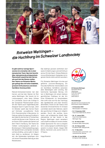 meine-region.ch meine-region.ch Vereine 651Fotograf:Fredi Waelti Rotweiss Wettingen %u2013 die Hochburg im Schweizer LandhockeyEs gibt wohl nur wenige Sportvereine im Limmattal, die in einer olympischen Team-Sportart bereits %u00fcber Jahrzehnte die erfolgreichste Mannschaft sowohl bei den Herren wie auch bei den Damen stellen. Den Teams von Rotweiss Wettingen gelingt dies mit hoher Stabilit%u00e4t, grossem Enthusiasmus und einem famili%u00e4ren Vereinsumfeld. Rekord-Schweizermeister bei den Herren und bei den Damen ist Rotweiss Wettingen. Der Verein ist im Leistungssport eine feste Gr%u00f6sse im Limmattal. Durch die Erfolge in der Schweizer Meisterschaft vertreten die Teams auch regelm%u00e4ssig den Aargauer Sport in ganz Europa. Jetzt im Oktober spielt das Herren-Team auf h%u00f6chster europ%u00e4ischer Stufe EHL Championship in Barcelona. Im Februar stehen Europacup Eins%u00e4tze in der Halle f%u00fcr die Herren in Tschechien und f%u00fcr die Damen in der T%u00fcrkei an, und an Ostern 2024 spielen die Damen auf dem Feld in Hamburg. Die Teams betreiben Leistungssport, jedoch zu Breitensport-Rahmenbedingungen. Die Spielerinnen und Spieler sind alle voll berufst%u00e4tig, und es gibt im Sport kein Geld zu verdienen. Im Gegenteil, die Spielenden beteiligen sich mit einem fi nanziellen Beitrag an den Reisekosten. Das bedingt grossen zeitlichen Aufwand, Entbehrungen und viel Enthusiasmus f%u00fcr den Sport. Dieses Bekenntnis zum Breitensport-Gedanken ist im ganzen Verein stark und tief verankert. F%u00fcr Rotweiss Wettingen ist eine gut gef%u00fchrte Junioren-Bewegung, ein freundschaftliches Vereinsleben und ein famili%u00e4res Verh%u00e4ltnis zwischen allen Beteiligten sehr wichtig. Der heimische Sportplatz Bernau mitten in Wettingen mit einem kleinen gem%u00fctlichen Clubhaus ist der %u00f6rtliche Mittelpunkt im Vereinsleben. Hier trifft man sich f%u00fcr die Trainings, den Spielbetrieb und viele Vereinsaktivit%u00e4ten. Rund um die Teams sind dutzende Ehrenamtliche im Einsatz und bilden damit den Rahmen, damit die sportlichen Erfolge erst m%u00f6glich werden. Durch die seri%u00f6se, konstante und erfolgreiche Arbeit %u00fcber Jahrzehnte ist der Verein in der Region Wettingen stark verankert und schafft es dadurch immer wieder,lokale Sponsoren f%u00fcr sich zu begeistern. Leistungssport und Breitensport vereint in einem Verein. Gegen 300 Aktive, Senioren und Junior:nnen in 13 Teams. Hopp Rotwiis!HC Rotweiss WettingenSportplatz BernauT%u00f6distrasse5430 Wettingenninfo@rww.chwww.rww.chVeranstaltungenAktuelle Termine entnehmen Sie bitte immer unserer Webseite.%u2022 24.November.2023Winterzauber%u0009im%u0009Clubhaus%u2022 16 - 17. Dezember 2023Final%u00094%u0009NLA%u0009Halle%u0009Herren,%u0009Z%u00fcrich%u2022 20. - 21. Januar 2024Final 4 NLA Halle Damen, Wettingen T%u00e4gi%u2022 16. - 18. Februar 2024EC%u0009Herren%u0009Halle,%u0009Pilzen%u0009(CZE)%u2022 22. - 25. Februar 2024EC%u0009Damen%u0009Halle,%u0009Alanya%u0009(TUR)%u2022 16. - 17. M%u00e4rz 2024Internationales Juniorinnen- und Juniorenturnier, Bernau%u2022 29. M%u00e4rz - 01. April 2024EC%u0009Damen%u0009Feld,%u0009Hamburg