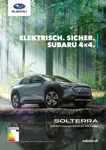 72 meine-region.ch VereineDER ERSTE VOLLELEKTRISCHE SUV VON SUBARU.Solterra AWD, 218 PS, 18,1 kWh/100 km, 0 g CO2/km, Kat. A subaru.chABCDEFGAELEKTRISCH. SICHER. SUBARU 4%u00d74. 230829_P23394_SUCALG-2023006_Solterra-Printanzeige_A4_D_RZ0.indd 1 22.08.23 11:58