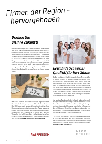 61 meine-region.ch meine-region.ch Kurzfirmenportr%u00e4ts TeaserFirmen der Region %u2013 hervorgehobenDenken Sie an Ihre Zukunft!Die Entscheidungen, die Sie heute treffen, bestimmen, wie Sie in Zukunft leben werden. Deshalb lohnt es sich, die Planung Ihrer Zukunft fr%u00fchzeitig in Angriff zu nehmen. Denken Sie an %u00fcber%u00fcber%u00fcbermorgen %u2013 am besten heute. Die Raiffeisenbank an der Limmat steht Ihnen als regionale Partnerin zur Seite und ber%u00e4t Sie in allen Fragen rund um die Vorsorge. Denn Vorsorgebed%u00fcrfnisse und -ziele sind v%u00f6llig unterschiedlich %u2013 je nachdem, wo man im Leben steht. Ob mitten im Leben oder erst gerade ins Berufsleben gestartet %u2013 es ist immer der richtige Zeitpunkt, um das Vorsorgewissen auszubauen. Bew%u00e4hrte Schweizer Qualit%u00e4t f%u00fcr Ihre Z%u00e4hneBei Dr. med. dent. Nico B%u00fchler und seinem Team sind Sie in besten H%u00e4nden. Ihr pers%u00f6nliches Wohlergehen steht im Mittelpunkt: Hier wird alles daf%u00fcr getan, dass Ihre Behandlung v%u00f6llig schmerzfrei und effi zient vonstatten geht. Es ist keine unpers%u00f6nliche Zahnarztpraxis-Kette mit unz%u00e4hligen Niederlassungen, sondern eine eigenst%u00e4ndige und unabh%u00e4ngige, inhabergef%u00fchrte Zahnarztpraxis, f%u00fcr deren h%u00f6chste Schweizer Qualit%u00e4tsarbeit der Limmattaler Dr. med. dent. Nico B%u00fchler pers%u00f6nlich mit seinem Namen steht und b%u00fcrgt. Nur wenige Zahn%u00e4rzte in der Schweiz haben eine solch breitgef%u00e4cherte Ausbildung auf dem gesamten Gebiet der rekonstruktiven Zahnmedizin und Implantologie sowie umfassende jahrelange praktische Erfahrung in den wichtigsten Bereichen der Zahnmedizin, der vorbeugenden Prophylaxe und Behandlung verschiedenster, auch komplexer Zahnprobleme wie er. Mit einem kompletten Dienstleistungsangebot sind er und sein engagiertes, sympathisches Team f%u00fcr Sie da und sorgen mit einer professionellen Prophylaxe f%u00fcr eine optimale Gesundheit und Wohlbefi nden. www.zahnarzt-buehler.chMit einer starken privaten Vorsorge legen Sie den Grundstein f%u00fcr die ganz grossen Ziele in Ihrem Leben. Die Raiffeisenbank an der Limmat unterst%u00fctzt ihre Kundschaft gerne mit wissenswerten Tipps %u2013 passend auf die Lebensumst%u00e4nde der Kundinnen und Kunden abgestimmt. Informieren Sie sich jetzt auch auf der Webseite der Raiffeisen %u00fcber %u00abTeilzeitarbeit und Vorsorge%u00bb, %u00abFrauen und Vorsorge%u00bb oder %u00abSelbst%u00e4ndigkeit und Vorsorge%u00bb. www.raiffeisen.ch/anderlimmat