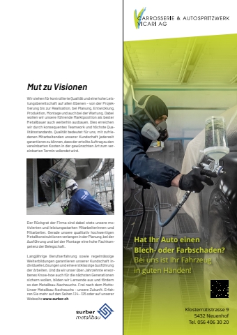 1 meine-region.ch Teaser meine-region.ch Inhalt 7Firmen der Region %u2013 hervorgehobenDenken Sie an Ihre Zukunft!Die Entscheidungen, die Sie heute treffen, bestimmen, wie Sie in Zukunft leben werden. Deshalb lohnt es sich, die Planung Ihrer Zukunft fr%u00fchzeitig in Angriff zu neh,men. Denken Sie an %u00fcber%u00fcber%u00fcbermorgen %u2013 am besten heute. Die Raiffeisenbank an der Limmat steht Ihnen als regionale Partnerin zur Seite und ber%u00e4t Sie in allen Fragen rund um die Vorsorge. Denn Vorsorgebed%u00fcrf,nisse und -ziele sind v%u00f6llig unterschiedlich %u2013 je nach,dem, wo man im Leben steht. Ob mitten im Leben oder erst gerade ins Berufsleben gestartet %u2013 es ist immer der richtige Zeitpunkt, um das Vorsorgewissen auszu,bauen. Bew%u00e4hrte Schweizer Qualit%u00e4t f%u00fcr Ihre Z%u00e4hneBei Dr. med. dent. Nico B%u00fchler und seinem Team sind Sie in besten H%u00e4nden. Ihr pers%u00f6nliches Wohlergehen steht im Mittelpunkt: Hier wird alles daf%u00fcr getan, dass Ihre Behandlung v%u00f6llig schmerzfrei und effi zient vonstatten geht. Es ist keine unpers%u00f6nliche Zahnarztpraxis-Kette mit unz%u00e4hligen Niederlassungen, sondern eine eigen,st%u00e4ndige und unabh%u00e4ngige, inhabergef%u00fchrte Zahnarzt,praxis, f%u00fcr deren h%u00f6chste Schweizer Qualit%u00e4tsarbeit der Limmattaler Dr. med. dent. Nico B%u00fchler pers%u00f6nlich mit seinem Namen steht und b%u00fcrgt. Nur wenige Zahn%u00e4rzte in der Schweiz haben eine solch breitgef%u00e4cherte Ausbildung auf dem gesamten Gebiet der rekonstruktiven Zahnmedizin und Implantologie sowie umfassende jahrelange praktische Erfahrung in den wichtigsten Bereichen der Zahnmedizin, der vor,beugenden Prophylaxe und Behandlung verschiedens,ter, auch komplexer Zahnprobleme wie er. Mit einem kompletten Dienstleistungsangebot sind er und sein engagiertes, sympathisches Team f%u00fcr Sie da und sorgen mit einer professionellen Prophy,laxe f%u00fcr eine optimale Gesundheit und Wohlbefi nden. www.zahnarzt-buehler.chMit einer starken privaten Vorsorge legen Sie den Grundstein f%u00fcr die ganz grossen Ziele in Ihrem Leben. Die Raiffeisenbank an der Limmat unterst%u00fctzt ihre Kundschaft gerne mit wissenswerten Tipps %u2013 passend auf die Lebensumst%u00e4nde der Kundinnen und Kunden abgestimmt. Informieren Sie sich jetzt auch auf der Webseite der Raiffeisen %u00fcber %u00abTeilzeitarbeit und Vor,sorge%u00bb, %u00abFrauen und Vorsorge%u00bb oder %u00abSelbst%u00e4ndigkeit und Vorsorge%u00bb. www.raiffeisen.ch/anderlimmatMut zu VisionenWir stehen f%u00fcr kontrollierte Qualit%u00e4t und eine hohe Leistungsbereitschaft auf allen Ebenen - von der Projektierung bis zur Realisation, bei Planung, Entwicklung, Produktion, Montage und auch bei der Wartung. Dabei wollen wir unsere f%u00fchrende Marktposition als bester Metallbauer auch weiterhin ausbauen. Dies erreichen wir durch konsequentes Teamwork und h%u00f6chste Qualit%u00e4tsstandards. Qualit%u00e4t bedeutet f%u00fcr uns, mit zufriedenen Mitarbeitenden unserer Kundschaft jederzeit garantieren zu k%u00f6nnen, dass der erteilte Auftrag zu den vereinbarten Kosten in der gew%u00fcnschten Art zum vereinbarten Termin vollendet wird.Der R%u00fcckgrat der Firma sind dabei stets unsere motivierten und leistungsstarken Mitarbeiterinnen und Mitarbeiter. Gerade unsere qualitativ hochwertigen Metallkonstruktionen verlangen in der Planung, bei der Ausf%u00fchrung und bei der Montage eine hohe Fachkompetenz der Belegschaft.Langj %u00e4hrige Berufserfahrung sowie regelm%u00e4ssige Weiterbildungen garantieren unserer Kundschaft individuelle L%u00f6sungen und eine erstklassige Ausf%u00fchrung der Arbeiten. Und da wir unser %u00fcber Jahrzehnte erworbenes Know-how auch f%u00fcr die n%u00e4chsten Generationen sichern wollen, bilden wir Lernende aus und f%u00f6rdern so den Metallbau-Nachwuchs. Frei nach dem Motto: Unser Metallbau-Nachwuchs %u2013 unsere Zukunft. Erfahren Sie mehr auf den Seiten 124 - 125 oder auf unserer Webseite www.surber.chInserat halbseitig, 101 x 297 mmKlosterr%u00fctistrasse 95432 Neuenhof Tel. 056 406 30 20 Hat Ihr Auto einen Blech- oder Farbschaden?Bei uns ist Ihr Fahrzeug in guten H%u00e4nden!
