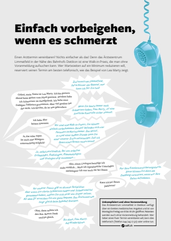 90 meine-region.ch InhaltEinfach vorbeigehen, wenn es schmerztEinen Arzttermin vereinbaren? Nichts einfacher als das! Denn das %u00c4rztezentrum Limmatfeld in der N%u00e4he des Bahnhofs Dietikon ist eine Walk-in-Praxis, die man ohne Voranmeldung aufsuchen kann. Wer Wartezeiten auf ein Minimum reduzieren will, reserviert seinen Termin am besten telefonisch, wie das Beispiel von Lea Marty zeigt.%u00c4rztezentrum Limmatfeld, Petra H%u00fcsser am Apparat, waskann ich f%u00fcr Sie tun?Wir sind eine Walk-in-Praxis, Sie k%u00f6nnen einfach vorbeikommen. Derzeit befinden sich vier Personen im Wartezimmer. Das heisst,in rund einer halben Stunde kann Sie einer unserer %u00c4rzte untersuchen. Soll ich Ihnen einen Termin reservieren?Wenn Sie heute immer nochSchmerzen haben, Frau Marty, ist eine %u00e4rztliche Kontrolle sicher sinnvoll.Ich habe aberkeinen Hausarzt.Ja, das w%u00e4re super. Ist auch eine R%u00f6ntgenuntersuchung m%u00f6glich?Gr%u00fcezi, mein Name ist Lea Marty. Ich bin gestern Abend beim Reiten vom Pferd gest%u00fcrzt. Seitdem habe ich Schmerzen im Handgelenk. Ich habe zweiDafalgan-Tabletten genommen. Aber viel gen%u00fctzt hat das nicht. Ich f%u00fcrchte, da ist was gebrochen.Ja, selbstverst%u00e4ndlich. Bei uns arbeitenOrthop%u00e4den, Radiologen, Rheumatologenund Urologen eng zusammen%u2026Vor unserer Praxis gibt es diverse Parkpl%u00e4tze. Aber wenn Sie starke Schmerzen haben und Schmerzmittelgenommen haben, sollten Sie sich nicht ans Steuer setzen. Mit dem %u00d6V erreichen Sie uns ganz bequem. Das %u00c4rztezentrum liegt gleich beim Bahnhof Dietikon.Bis dann, Frau Marty.Auf Wiederh%u00f6ren.Okay, dann nehme ich den Bus. Besten Dank und bis gleich.Unkompliziert und ohne VoranmeldungDas %u00c4rztezentrum Limmatfeld in Dietikon verf%u00fcgt %u00fcber ein breites medizinisches Angebot und ist von Montag bis Freitag von 8 bis 18 Uhr ge%u00f6ffnet. Patienten werden auch ohne Voranmeldung behandelt. Wer lieber einen fixen Termin vereinbaren will, kann dies telefonisch (Telefon 044 745 17 50) oder online tun.azlf.chAlso, einen Urologen ben%u00f6tige ich nicht wirklich%u2009%u2026 Muss ich irgendwelche Unterlagen mitbringen? Ich war noch nie bei Ihnen. Nur Ihre Krankenversicherungskarte. Diese k%u00f6nnen Sie dann am Empfang vorweisen, wenn wir Ihre Daten aufnehmen.Kann ich bei Ihnen parkieren?