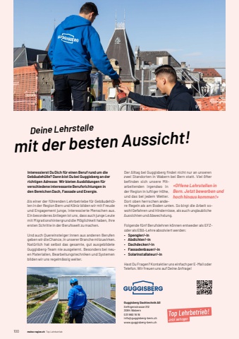 100 meine-region.ch Top Lehrbetrieb meine-region.ch Top Lehrbetriebe 1Guggisberg Dachtechnik AGSeftigenstrasse 3123084%u0009Wabern031 960 16 16info@guggisberg-bern.chwww.guggisberg-bern.ch Deine Lehrstellemit der besten Aussicht!Interessierst Du Dich f%u00fcr einen Beruf rund um die Geb%u00e4udeh%u00fclle? Dann bist Du bei Guggisberg an der richtigen Adresse: Wir bieten Ausbildungen f%u00fcr verschiedene interessante Berufsrichtungen in den Bereichen Dach, Fassade und Energie.Als einer der f%u00fchrenden Lehrbetriebe f%u00fcr Geb%u00e4udeh%u00fcllen in der Region Bern und K%u00f6niz bilden wir mit Freude und Engagement junge, interessierte Menschen aus. Ein besonderes Anliegen ist uns, dass auch junge Leute mit Migrationshintergrund die M%u00f6glichkeit haben, ihre ersten Schritte in der Berufswelt zu machen.Und auch Quereinsteiger:innen aus anderen Berufen geben wir die Chance, in unserer Branche mitzuwirken. Nat%u00fcrlich hat selbst das gesamte, gut ausgebildete Guggisberg-Team nie ausgelernt. Besonders bei neuen Materialien, Bearbeitungstechniken und Systemen bilden wir uns regelm%u00e4ssig weiter.Der Alltag bei Guggisberg fi ndet nicht nur an unseren zwei Standorten in Wabern bei Bern statt. Viel %u00f6fter befi nden sich unsere Mitarbeitenden irgendwo in der Region in luftiger H%u00f6he, und das bei jedem Wetter. Dort oben herrschen andere Regeln als am Boden unten. So birgt die Arbeit sowohl Gefahren und Hindernisse, als auch unglaubliche Aussichten und Abwechslung.Folgende f%u00fcnf Berufslehren k%u00f6nnen entweder als EFZoder als EBA-Lehre absolviert werden:%u2022 Spengler/-in%u2022 Abdichter/-in%u2022 Dachdecker/-in%u2022 Fassadenbauer/-in%u2022 Solarinstallateur/-inHast Du Fragen? Kontaktier uns einfach per E-Mail oder Telefon. Wir freuen uns auf Deine Anfrage!%u00abOffene Lehrstellen in Bern. Jetzt bewerben und hoch hinaus kommen!%u00bb