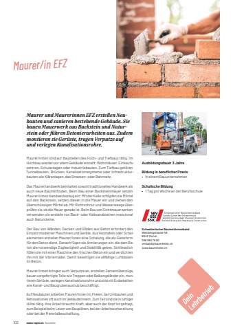 102 meine-region.ch meine-region.ch Berufsbild BerufsbilderMaurer/in EFZMaurer und Maurerinnen EFZ erstellen Neubauten und sanieren bestehende Geb%u00e4ude. Sie bauen Mauerwerk aus Backstein und Naturstein oder f%u00fchren Betonierarbeiten aus. Zudem montieren sie Ger%u00fcste, tragen Verputze auf und ver legen Kanalisationsrohre.Maurer/innen sind auf Baustellen des Hoch- und Tiefbaus t%u00e4tig. Im Hochbau werden vor allem Geb%u00e4ude erstellt: Wohnh%u00e4user, Einkaufszentren, Schulanlagen oder Industriebauten. Zum Tiefbau geh%u00f6ren Tunnelbauten, Br%u00fccken, Kanalisationssysteme oder Infrastrukturbauten wie Kl%u00e4ranlagen, das Strassen- oder Bahnnetz.Das Maurerhandwerk beinhaltet sowohl traditionelles Handwerk als auch neue Baumethoden. Beim Bau einer Backsteinmauer setzen Maurer/innen Handwerkszeug ein: Mit der Kelle sch%u00f6pfen sie M%u00f6rtel auf den Backstein, setzen diesen in die Mauer ein und ziehen den %u00fcbersch%u00fcssigen M%u00f6rtel ab. Mit Richtschnur und Wasserwaage %u00fcberpr%u00fcfen sie, ob die Mauer gerade ist. Beim Bau von Sichtmauerwerken verwenden sie anstelle von Back- oder Kalksandsteinen manchmal auch Natur steine.Der Bau von W%u00e4nden, Decken und B%u00f6den aus Beton erfordert den Einsatz moderner Maschinen und Ger%u00e4te. Aus Holztafeln oder Schalelementen erstellen Maurer/innen eine Schalung, die als Giessform f%u00fcr den Beton dient. Danach f%u00fcgen sie Armierungen ein, die dem Beton die notwendige Zugfestigkeit und Stabilit%u00e4t geben. Schliesslich f%u00fcllen sie mit einer Maschine den frischen Beton ein und verdichten ihn mit der Vibriernadel. Damit beseitigen sie allf%u00e4llige Luftblasen im Beton. Maurer/innen bringen auch Verputze an, erstellen Zement%u00fcberz%u00fcge, bauen vorgefertigte Teile wie Treppen oder Balkongel%u00e4nder ein, montieren Ger%u00fcste, verlegen Kanalisationsrohre und sind mit Erdarbeiten wie Kanal- und Baugrubenaushub besch%u00e4ftigt.Auf Neubauten arbeiten Maurer/innen im Freien, bei Umbauten und Renovationen oft auch im Geb%u00e4udeinnern. Zum Teil sind sie in luftiger H%u00f6he t%u00e4tig. Ihre Arbeit braucht Kraft, aber auch der Kopf ist gefragt, zum Beispiel beim Lesen von Baupl%u00e4nen, bei der Arbeitsvorbereitung oder bei der Materialbeschaffung.Schweizerischer BaumeisterverbandWeinbergstrasse%u0009498042%u0009Z%u00fcrich058 360 76 00verband@baumeister.chwww.baumeister.chAusbildungsdauer 3 JahreBildung in berufl icher Praxis%u2022 In einem BauunternehmenSchulische Bildung %u2022 1 Tag pro Woche an der Berufsschule