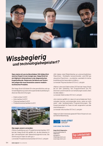 104 meine-region.ch Top Lehrbetrieb meine-region.ch Top Lehrbetriebe 1Haag-Streit DiagnosticsGartenstadtstrasse 103098%u0009K%u00f6niz031 978 01 11info@haag-streit.comwww.haag-streit.comWissbegierig und technologiebegeistert?Dann starte mit uns ins Berufs leben! Wir bilden Dich zum/zur Expert:in von morgen aus. Haag-Streit ist ein Hightech-Unternehmen in der diagnostischen Augenheilkunde. Modernste Verfahren und Techniken pr%u00e4gen die neue Generation unserer medizintechnischen Produkte.Die Haag-Streit AG bietet Dir eine pers%u00f6nliche und optimale Begleitung sowie eine spannende Ausbildung in diversen Berufsrichtungen:%u2022 Elektroniker/in EFZ %u2022 Informatiker/in EFZ %u2022 Polymechaniker/in EFZ %u2022 Produktionsmechaniker/in EFZ %u00abWir haben viele M%u00f6glichkeiten an unterschiedlichen Maschinen %u2013 Drehbank, konventionelle- und CNC-gesteuerten Maschinen %u2013 zu arbeiten, weshalb ich meine Ausbildung hier besonders sch%u00e4tze.%u00bbLernender Polymechaniker EFZ im 2. Lehrjahr%u00abMeine Lehre als Elektroniker EFZ bei der Haag-Streit AG ist sehr vielseitig. Von Programmieren am PC, Zeichnen und Simulieren von Schaltungen sowie L%u00f6ten ist alles dabei.%u00bb Lernender Elektroniker EFZ im 3. Lehrjahr%u00abAm meisten gef%u00e4llt mir, dass ich verschiedenste Technologien kennen und anwenden lerne, seien es software- oder hardwarenahe Programmierungen. Die Zusammenarbeit im Team ist sehr angenehm und alle sind hilfsbereit.%u00bb Lernender Informatiker EFZ im 3. LehrjahrHaben wir Dein Interesse geweckt? Dann freuen wir uns auf Deine Bewerbung. Das sagen unsere Lernenden:%u00abMeine Ausbildung zum Produktionsmechaniker EFZ bei der Haag-Streit AG gef%u00e4llt mir, da die Arbeiten in der Lehrwerkstatt sehr abwechslungsreich sind. Die Stimmung im Team ist sehr gut.%u00bb Lernender Produktionsmechaniker EFZ im 2. Lehrjahr