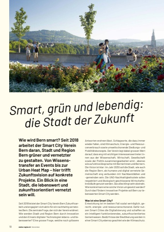10 meine-region.ch meine-region.ch GemeindenSmart, gr%u00fcn und lebendig: die Stadt der ZukunftWie wird Bern smart? Seit 2018 arbeitet der Smart City Verein Bern daran, Stadt und Region Bern gr%u00fcner und vernetzter zu gestalten. Von Wissenstransfer an Events bis zur Urban Heat Map %u2013 hier trifft Zukunftsvision auf konkrete Projekte. Ein Blick in eine Stadt, die lebenswert und zukunftsorientiert vernetzt sein will.Seit 2018 leistet der Smart City Verein Bern Zukunftsarbeit und engagiert sich aktiv f%u00fcr ein nachhaltig vernetztes Bern. Die zentrale Frage, der sich der Verein widmet: Wie werden Stadt und Region Bern durch Innovation und den Einsatz digitaler Technologien lebens- und liebenswerter? Eine grosse Frage, welche noch gr%u00f6ssere Antworten erahnen l%u00e4sst. Schlagworte, die dazu immer wieder fallen, sind Klimaschutz, Energie- und Ressourcenverbrauch sowie umweltschonende Siedlungs- und Mobilit%u00e4tskonzepte. Der Verein legt dabei grossen Wert darauf, dass eng mit wichtigen Interessensvertreter:innen aus der Wissenschaft, Wirtschaft, Gesellschaft sowie der Politik zusammengearbeitet wird - ebenso wie auf aktive Absprache mit Bernerinnen und Bernern. Die Vision ist klar: Im Jahr 2030 soll die Stadt, wie auch die Region Bern, als humane und digital vernetzte Gemeinschaft eng verbunden mit Nachbarst%u00e4dten und -gemeinden sein. Die UNO-Nachhaltigkeitsziele sollen respektiert und %u00f6kologisch geschlossene Wirtschaftskreisl%u00e4ufe genutzt werden. Das alles klingt sehr abstrakt. Wie konkret kann eine solche Vision umgesetzt werden? Durch das F%u00f6rdern innovativer Projekte soll Bern zur lebenswerten Smart City werden.Was ist eine Smart City?Entwicklung ist im besten Fall sozial vertr%u00e4glich, gerecht, energie- und ressourcenschonend. Daf%u00fcr nutzen Smart Cities die Digitalisierung und schaffen so ein intelligent funktionierendes, zukunftsorientiertes Gemeinwesen. Bed%u00fcrfnisse der Bev%u00f6lkerung werden in einer Smart City ebenso geachtet wie der Klimaschutz.