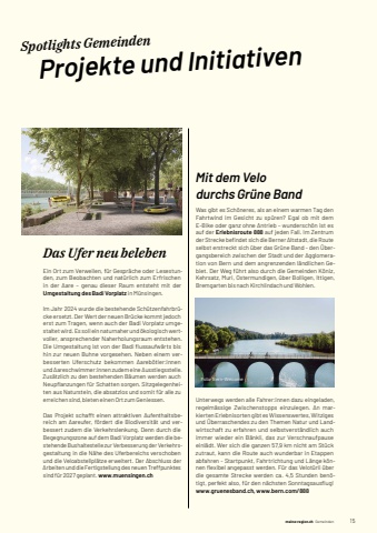 meine-region.ch meine-region.ch Gemeinden 151Spotlights Gemeinden Projekte und InitiativenDas Ufer neu belebenEin Ort zum Verweilen, f%u00fcr Gespr%u00e4che oder Lesestunden, zum Beobachten und nat%u00fcrlich zum Erfrischen in der Aare %u2013 genau dieser Raum entsteht mit der Umgestaltung des Badi Vorplatz in M%u00fcnsingen.Im Jahr 2024 wurde die bestehende Sch%u00fctzenfahrbr%u00fccke ersetzt. Der Wert der neuen Br%u00fccke kommt jedoch erst zum Tragen, wenn auch der Badi Vorplatz umgestaltet wird. Es soll ein naturnaher und %u00f6kologisch wertvoller, ansprechender Naherholungsraum entstehen. Die Umgestaltung ist von der Badi fl ussaufw%u00e4rts bis hin zur neuen Buhne vorgesehen. Neben einem verbesserten Uferschutz bekommen Aareb%u00f6tler:innen und Aareschwimmer:innen zudem eine Ausstiegsstelle. Zus%u00e4tzlich zu den bestehenden B%u00e4umen werden auch Neupfl anzungen f%u00fcr Schatten sorgen. Sitzgelegenheiten aus Naturstein, die absatzlos und somit f%u00fcr alle zu erreichen sind, bieten einen Ort zum Geniessen.Das Projekt schafft einen attraktiven Aufenthaltsbereich am Aareufer, f%u00f6rdert die Biodiversit%u00e4t und verbessert zudem die Verkehrslenkung. Denn durch die Begegnungszone auf dem Badi Vorplatz werden die bestehende Bushaltestelle zur Verbesserung der Verkehrsgestaltung in die N%u00e4he des Uferbereichs verschoben und die Veloabstellpl%u00e4tze erweitert. Der Abschluss der Arbeiten und die Fertigstellung des neuen Treffpunktes sind f%u00fcr 2027 geplant. www.muensingen.chMit dem Velo durchs Gr%u00fcne BandWas gibt es Sch%u00f6neres, als an einem warmen Tag den Fahrtwind im Gesicht zu sp%u00fcren? Egal ob mit dem E-Bike oder ganz ohne Antrieb %u2013 wundersch%u00f6n ist es auf der Erlebnisroute 888 auf jeden Fall. Im Zentrum der Strecke befi ndet sich die Berner Altstadt, die Route selbst erstreckt sich %u00fcber das Gr%u00fcne Band - den %u00dcbergangsbereich zwischen der Stadt und der Agglomeration von Bern und dem angrenzenden l%u00e4ndlichen Gebiet. Der Weg f%u00fchrt also durch die Gemeinden K%u00f6niz, Kehrsatz, Muri, Ostermundigen, %u00fcber Bolligen, Ittigen, Brem garten bis nach Kirchlindach und Wohlen.Unterwegs werden alle Fahrer:innen dazu eingeladen, regelm%u00e4ssige Zwischenstopps einzulegen. An markierten Erlebnisorten gibt es Wissenswertes, Witziges und %u00dcberraschendes zu den Themen Natur und Landwirtschaft zu erfahren und selbstverst%u00e4ndlich auch immer wieder ein B%u00e4nkli, das zur Verschnaufpause einl%u00e4dt. Wer sich die ganzen 57,9%u00a0km nicht am St%u00fcck zutraut, kann die Route auch wunderbar in Etappen abfahren - Startpunkt, Fahrtrichtung und L%u00e4nge k%u00f6nnen fl exibel angepasst werden. F%u00fcr das Velot%u00fcrli %u00fcber die gesamte Strecke werden ca. 4,5%u00a0 Stunden ben%u00f6tigt, perfekt also, f%u00fcr den n%u00e4chsten Sonntagsausfl ug! www.gruenesband.ch, www.bern.com/888Foto:%u0009Bern-Welcome