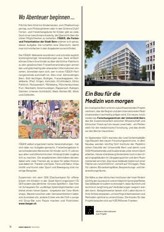 162 meine-region.ch meine-region.ch GemeindenWo Abenteuer beginnen %u2026M%u00f6chte Dein Kind ins Kindertanzen, zum Pfadischnuppertag, zum Philosophieren oder in den Science Club? Ferien- und Freizeitangebote f%u00fcr Kinder gibt es viele. Doch ist es manchmal schwierig, die %u00dcbersicht %u00fcber die vielen M%u00f6glichkeiten zu behalten. F%u00c4GER, die Ferienund Freizeitaktion der Stadt Bern widmet sich genau dieser Aufgabe: Sie schaffen eine %u00dcbersicht, damit man sich einfacher in den Angeboten zurechtfi ndet.Die F%u00c4GER-Webseite koordiniert und schreibt explizit kosteng%u00fcnstiger Veranstaltungen aus. Ganz einfach k%u00f6nnen Eltern ihre Kinder so %u00fcber die Online-Plattform zu den gew%u00fcnschten Freizeitveranstaltungen anmelden und gleichzeitig alle relevanten Informationen einsehen. Anmelden kann sich, wer in einer F%u00c4GER-Partnergemeinde wohnhaft ist. Dies sind: Allmendingen, Bern, Boll-Vechigen, Bolligen, Frauenkappelen, Hindelbank, Iffwil, Ittigen, Kehrsatz, Kirchlindach, K%u00f6niz, Meikirch, Moosseedorf, M%u00fchleberg, M%u00fcnchenbuchsee, Muri, Oberbalm, Ostermundigen, Rapperswil, Rubigen, Stettlen, Urtenen-Sch%u00f6nb%u00fchl, Wald, Wohlen BE, Worb und Zollikofen.F%u00c4GER selbst organisiert keine Veranstaltungen - hat sich aber zur Aufgabe gemacht, Freizeitangebote in verschiedensten Bereichen f%u00fcr Kinder von 5-17 Jahren aus allen sozio%u00f6konomischen Hintergr%u00fcnden zug%u00e4nglich zu machen. Die angebotenen Aktivit%u00e4ten decken dabei sehr viele Themen ab, so dass f%u00fcr jedes Kind etwas dabei ist: Theater und Spiel, Tiere und Natur, Kreativit%u00e4t und Kunst oder Sport und Bewegung sind nur einige Beispiele.Zusammen mit dem DOK (Dachverband f%u00fcr offene Arbeit mit Kindern in der Stadt Bern) organisiert F%u00c4GER zudem das j%u00e4hrliche %u00abGrosse Spielfest%u00bb. Das Fest ist Schauplatz f%u00fcr unz%u00e4hlige Spielm%u00f6glichkeiten und bietet einen riesen Spass - Angebote wie Tanz-Workshops, Wasserrutschen oder Harrassenklettern laden zum Austoben ein, andere Ecken wie die Chill-Lounge mit Sirup-Bar zum Pause machen und Picknicken.www.faeger.chEin Bau f%u00fcr die Medizin von morgenAm Inselspital Bern wird ein zukunftsweisendes Projekt realisiert, das die Region und den internationalen Medizinalstandort nachhaltig pr%u00e4gen wird: Ein neues, hochmodernes Forschungszentrum der Universit%u00e4t Bern, das die Zusammenarbeit zwischen Wissenschaft und klinischer Praxis auf ein neues Level hebt - ein Meilenstein f%u00fcr die medizinische Forschung, und das direkt vor den Berner Haust%u00fcren.Im September 2024 startete die rund f%u00fcnfeinhalbj%u00e4hrige Bauzeit des neuen Forschungszentrums. In dem Neubau werden k%u00fcnftig f%u00fcnf Institute der Medizinischen Fakult%u00e4t der Universit%u00e4t Bern und damit rund 1000 Mitarbeitende und Studierende unter einem Dach arbeiten. Heute sind diese gr%u00f6sstenteils noch in den Ursprungsgeb%u00e4uden im L%u00e4nggassquartier und dem Muesmattareal verortet. Das neue Geb%u00e4ude bietet auf einer Fl%u00e4che von rund 20 000 m2, verteilt auf 13 Etagen, Platz f%u00fcr Labore, B%u00fcroarbeitspl%u00e4tze, Besprechungs- und Veranstaltungsr%u00e4ume.Die N%u00e4he zu den klinischen Instituten der Insel f%u00f6rdert k%u00fcnftig den Austausch und erm%u00f6glicht Synergieeffekte. Das Geb%u00e4ude ist zudem so konzipert, dass r%u00e4umlich und technisch langfristig auf Ver%u00e4nderungen reagiert werden kann: Beispielsweise lassen sich Laborr%u00e4ume in ihrer Gr%u00f6sse anpassen, um k%u00fcnftige Arbeitsweisen und Methoden optimal zu unterst%u00fctzen. Die Kosten f%u00fcr das Projekt belaufen sich auf 435 Millionen Franken. Weitere%u0009Informationen%u0009zum%u0009Projekt