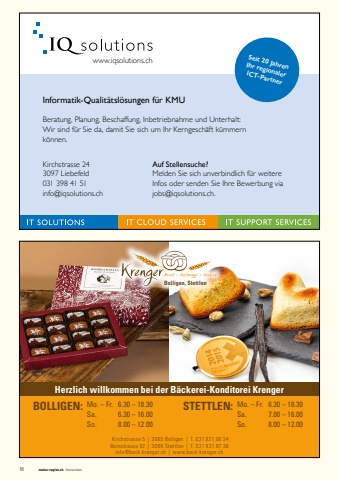 18 meine-region.ch GemeindenSTETTLEN: Mo. %u2013 Fr. 6.30 %u2013 18.30Sa. 7.00 %u2013 16.00So. 8.00 %u2013 12.00BOLLIGEN: Mo. %u2013 Fr. 6.30 %u2013 18.30Sa. 6.30 %u2013 16.00So. 8.00 %u2013 12.00 Kirchstrasse 5 | 3065 Bolligen | T. 031 921 00 34Bernstrasse 92 | 3066 Stettlen | T. 031 931 87 36info@beck-krenger.ch | www.beck-krenger.chBolligen, StettlenHerzlich willkommen bei der B%u00e4ckerei-Konditorei Krengerwww.iqsolutions.ch Seit 20 Jahren Ihr regionaler ICT-PartnerInformatik-Qualit%u00e4tsl%u00f6sungen f%u00fcr KMUBeratung, Planung, Beschaffung, Inbetriebnahme und Unterhalt: Wir sind f%u00fcr Sie da, damit Sie sich um Ihr Kerngesch%u00e4ft k%u00fcmmern k%u00f6nnen.Auf Stellensuche?Melden Sie sich unverbindlich f%u00fcr weitere Infos oder senden Sie Ihre Bewerbung via jobs@iqsolutions.ch.Kirchstrasse 243097 Liebefeld031 398 41 51info@iqsolutions.ch
