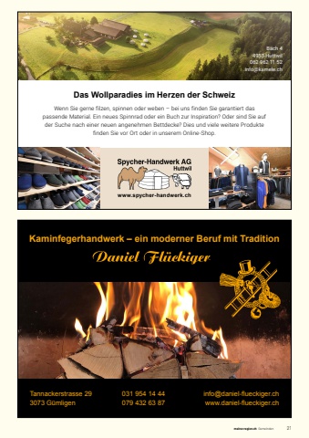 meine-region.ch Gemeinden 21Kaminfegerhandwerk %u2013 ein moderner Beruf mit TraditionTannackerstrasse 293073 G%u00fcmligeninfo@daniel-fl ueckiger.chwww.daniel-fl ueckiger.ch031 954 14 44 079 432 63 87Das Wollparadies im Herzen der SchweizWenn Sie gerne filzen, spinnen oder weben %u2013 bei uns finden Sie garantiert das passende Material. Ein neues Spinnrad oder ein Buch zur Inspiration? Oder sind Sie auf der Suche nach einer neuen angenehmen Bettdecke? Dies und viele weitere Produkte finden Sie vor Ort oder in unserem Online-Shop.B%u00e4ch 44953 Huttwil 062 962 11 52 info@kamele.ch www.spycher-handwerk.ch