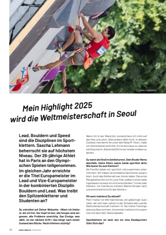 241 meine-region.ch meine-region.ch Profisportler Profi sportler Mein Highlight 2025 wird die Weltmeisterschaft in SeoulLead, Bouldern und Speed sind die Disziplinen im Sportklettern. Sascha Lehmann beherrscht sie auf h%u00f6chstem Niveau. Der 26-j%u00e4hrige Athlet hat in Paris an den Olympischen Spielen teilgenommen. Im gleichen Jahr erreichte er die Titel Europameister im Lead und Vize-Europameister in der kombinierten Disziplin Bouldern und Lead. Was treibt den Spitzenkletterer und Studenten an? Du schreibst auf Deiner Webseite: %u00abWenn ich klettere, bin ich frei. Der Kopf ist leer, alle Sorgen sind vergessen, alle Probleme unwichtig. Das Einzige, was z%u00e4hlt, ist der n%u00e4chste Griff.%u00bb Das klingt nach einem Zustand des Gl%u00fccks. Macht Klettern s%u00fcchtig? Wenn ich in der Wand bin, konzentriere ich mich auf das Hier und Jetzt. Alles andere z%u00e4hlt nicht. In diesem Zustand, man kennt ihn unter dem Begriff %u00abfl ow%u00bb, habe ich meine besten Auftritte. Es ist durchaus so, dass es s%u00fcchtig macht, dieses Gef%u00fchl immer wieder erleben zu d%u00fcrfen. Du warst als Kind im Ger%u00e4teturnen, Dein Bruder Remo ebenfalls. Deine Eltern waren beide sportlich aktiv. Wie kamst Du zum Klettern?Als Familie haben wir sportlich viel zusammen unternommen. Wir haben verschiedene Sportarten ausprobiert. Auch das Kletterseil war immer dabei. Das erste Mal geklettert bin ich im Jura-Fels, sp%u00e4ter in einer Halle. Irgendwann musste ich mich entscheiden: Turnen oder Klettern. Ich machte es meinem %u00e4lteren Bruder nach und entschied mich f%u00fcr das Klettern. Mit wem trainierst Du aktuell?Mein Trainer ist Will Hammersla, ein geb%u00fcrtiger Australier, der seit zwei Jahren in der Schweiz lebt und die Nationalmannschaft trainiert. Er hat meine Trainingsplanung %u00fcbernommen. Ansonsten trainiere ich zusammen mit dem SAC-Nationalkader. Sportklettern ist nach wie vor eine Randsportart. St%u00f6rt Dich das? Fotos: Romy Streit