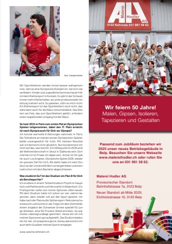 meine-region.ch Vereine 25Wir Sportkletterer werden immer besser wahrgenommen. Seit es eine Olympische Disziplin ist, hat sich viel ver%u00e4ndert. Kinder und Jugendliche kommen heute fr%u00fch mit dem Klettersport in Kontakt. Es gibt in der Schweiz immer mehr Kletterhallen, wo unter professioneller Anleitung trainiert wird. So gesehen, st%u00f6rt es mich nicht. Ein Breitensport ist das Sportklettern noch nicht, das w%u00e4re dann auch f%u00fcr die Natur einschneidend. Das Klettern am Fels, das zum Sportklettern geh%u00f6rt, erfordert einen respektvollen Umgang mit der Natur. Du hast 2024 in Paris zum ersten Mal an Olympischen Spielen teilgenommen, dabei den 17. Platz erreicht. Ist nach Olympia auch f%u00fcr Dich vor Olympia?Ich konnte wertvolle Erfahrungen sammeln in Paris. Die Teilnahme an meinen ersten Olympischen Spielen bleibt unvergesslich f%u00fcr mich. Mit meinem Resultat war ich dennoch nicht gl%u00fccklich. Nun konzentriere ich mich auf das, was kommt. Ein H%u00f6hepunkt im 2025 wird die Weltmeisterschaft in Seoul in S%u00fcdkorea sein. Dort m%u00f6chte ich im Finale mit dabei sein. Sicher ist f%u00fcr sp%u00e4ter auch Los Angeles, Olympische Spiele 2028, wieder ein grosses Ziel f%u00fcr mich. Bis dahin habe ich mein Studium an der Universit%u00e4t Bern vorangetrieben und eventuell schon mit dem Bachelor abgeschlossen. Was studierst Du? Ist das Studium ein Plan B f%u00fcr Dich als Berufssportler? Ich studiere in einem Teilzeitstudium Physik im Hauptfach und Mathematik und Informatik im Nebenfach. Ein Profi sportler sollte sich immer Optionen offen lassen. Mit dem Studium hatte ich schon vor vier Jahren begonnen, dann wieder voll auf den Sport gesetzt. Ich habe nach der Matura die Spitzensport-Rekrutenschule besucht und konnte in der Folge mit dem Zeitmilit%u00e4r, einem Angebot der Schweizer Armee speziell f%u00fcr junge Athleten, eine 50-Prozent-Stelle antreten. So war meine Lebensgrundlage gesichert. Heute bin ich mit meinen Sponsoren gut aufgestellt. Das Studium bedeutet mir viel, ich analysiere gerne. Genau das kommt mir auch beim Aus%u00fcben meines Sports entgegen.www.sascha-lehmann.chText: Claudia HutterInserat halbseitig, 101 x 297 mmWir feiern 50 Jahre!Malen, Gipsen, Isolieren, Tapezieren und GestaltenPassend zum Jubil%u00e4um beziehen wir 2025 unser neues Betriebsgeb%u00e4ude in Belp. Besuchen Sie unsere Webseite www.malereihodler.ch oder rufen Sie uns an 031 961 58 62.Malerei Hodler AGProvisorischer Standort: Bahnhofstrasse 7a, 3123 BelpNeuer Standort ab Mitte 2025: Eichholzstrasse 10, 3123 Belp