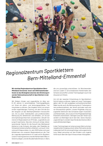 261 meine-region.ch meine-region.ch VereineRegionalzentrum Sportklettern Bern-Mittelland-EmmentalWir sind das Regionalzentrum Sportklettern BernMittelland-Emmental. Unser seit 2002 bestehender Verein ist das Bindeglied zwischen dem Breitensport und der Nationalmannschaft im Sportklettern in der Region Bern.Wir f%u00f6rdern Kinder und Jugendliche im Alter von 8 %u2013 20 Jahren in verschiedenen Trainingsgef%u00e4ssen, um ihnen ein alters- und leistungsgem%u00e4sses Training bieten zu k%u00f6nnen. Das Angebot reicht von einem ersten regelm%u00e4ssigen Training, mit dem Ziel die Kinder langsam an das Wettkampfklettern heranzuf%u00fchren, bis zu einer individuellen und professionellen Betreuung f%u00fcr Athletinnen und Athleten, um sie auf eine Spitzensportkarriere vorzubereiten. Aktuell trainieren im Regionalzentrum 37 Kinder, Jugendliche und junge Erwachsene. Darunter sind auch einige vielversprechende Talente f%u00fcr die Zukunft des Wettkampfkletterns in der Schweiz, die jedes Jahr Medaillen an Schweizermeisterschaften erklettern und auch international Erfolge erzielen. Im Jahr 2023 holten sich zwei Athletinnen von unserem Regionalzentrum die Titel als Jugendeuropameisterin im Lead und im Bouldern. Unsere Trainingszentren sind die Kletterhalle O%u2019Bloc in Ostermundigen und die Boulderhalle Bimano in Bern, die uns grossz%u00fcgig unterst%u00fctzen. An Wochenenden sind wir zudem in verschiedensten Kletterhallen der Schweiz anzutreffen und bei Trainingslagern auch mal draussen am Felsen.Um mit der rasanten Entwicklung im Sportklettern Schritt halten zu k%u00f6nnen, haben wir unser Trainingsangebot Jahr f%u00fcr Jahr ausgebaut und weiterentwickelt. Dabei wurde auch die Betreuung durch Trainerpersonen professionalisiert, der Verein wird aber nach wie vor ehrenamtlich gef%u00fchrt. Unsere Mitglieder sind uns zugeteilte Sektionen des Schweizer Alpen-Club (SAC) und Kletterhallen, die uns durch ihre Mitgliederbeitr%u00e4ge fi nanziell unterst%u00fctzen. Getragen wird der Verein ausserdem von Beitr%u00e4gen durch den SAC, Swiss-Olympic, Jugend & Sport und dem Sportfonds des Kantons Bern sowie Athletenbeitr%u00e4gen.In den Trainings legen wir einen grossen Wert auf einen respektvollen Umgang und wir sehen Motivation als die treibende Kraft f%u00fcr eine langfristige Leistungsentwicklung. Dabei versuchen wir den Kindern und Jugendlichen auch %u00fcber den Sport hinaus etwas mitzugeben.