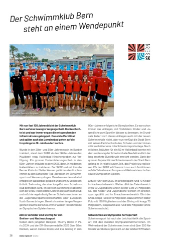281 meine-region.ch meine-region.ch VereineDer Schwimmklub Bern steht an einem WendepunktMit nun fast 100 Jahren blickt der Schwimmklub Bern auf eine bewegte Vergangenheit. Die Geschichte ist und war immer eng an die entsprechenden Infrastrukturen gekoppelt. Das erste Marzilibad und sp%u00e4ter auch das Lorrainebad gehen auf die Urspr%u00fcnge im 18. Jahrhundert zur%u00fcck. Wurde in den 20er- und 30er-Jahren noch im Bueber trainiert, stand dem SKBE ab den 1940er-Jahren das Muulbeeri resp. Hallenbad Hirschengraben zur Verf%u00fcgung. Ein grosser Modernisierungsschub in den 60er-Jahren erlaubte es dem SKBE dann, in modernen Hallenb%u00e4dern zu trainieren. Der SKBE und mit ihm die Berner Klubs im Metier Wasser geh%u00f6rten damit schon immer zu den Schweizer Top-Adressen im Schwimmsport und Wasserspringen. Daneben wurde und wird erfolgreich Wasserball gespielt und nicht zu vergessen Artistic Swimming, das aber losgel%u00f6st vom Schwimmklub betrieben wird. Im Bereich Swimming etablierte sich der SKBE in den letzten Jahren als Nachwuchsklub und m%u00f6chte regelm%u00e4ssig Berner Schwimmer:innen an die Jugendeuropameisterschaften oder European Youth Games bringen. Bereits in seiner langen Vergangenheit brachte der SKBE immer wieder Teilnehmende an Olympischen Spielen hervor. Aktive Vorbilder sind wichtig f%u00fcr den Breiten- und NachwuchssportNeben dem j%u00fcngsten Beispiel, Thierry Bollin in Paris 2024 und der EM-Bronzemedaille 2023 %u00fcber 50 m R%u00fccken, waren Carole Brook und Eva Gisling in den Trainingslager des Elite-Teams in Hurghada90er-Jahren erfolgreiche Olympioniken. Es war schon immer das Anliegen, mit Vorbildern Kinder und Jugendliche zum Sport im Wasser zu bewegen. Im Grundsatz %u00e4ndert sich dieses Anliegen auch mit der neuen Schwimmhalle nicht, aber nun verf%u00fcgt die Stadt Bern mit seinen Fachhochschulen, Schulen und der Universit%u00e4t auch %u00fcber eine tolle Schwimmsportanlage. Nach etlichen Anl%u00e4ufen f%u00fcr ein 50 m-Hallenbad konnte mit der Lancierung der Schwimmhalle Neufeld endlich der lang ersehnte Durchbruch erreicht werden. Dank der grossen Popularit%u00e4t des Schwimmens in der Stadt Bern gelang es in relativ kurzer Zeit, das Projekt zu realisieren. F%u00fcr den SKBE er%u00f6ffnen sich nun auch Ambitionen auf die Teilnahme an Europa- und Weltmeister schaften sowie Olympischen Spielen. Aktuell f%u00fchrt der SKBE im Breitensport rund 70 Kinder im Nachwuchsbereich. Weiter z%u00e4hlt der Talentbereich etwa 40 Jugendliche und in seiner Elite 24 Mitglieder. Ca. 160 Kinder und Jugendliche werden im Breitensport gez%u00e4hlt und im Erwachsenenbereich f%u00fchrt der SKBE knapp 100 aktive Mitglieder. Dazu kommen Water Polo mit 120 Mitgliedern und das Diving mit knapp 70 Mitgliedern, insgesamt also rund 580 Mitglieder (ohne Schwimmschule).Schwimmen als Olympische KernsportartSchwimmsport ist nach der Leichtathletik die Sportart mit den meisten Olympiateilnehmer:innen. Im Weltverband der Schwimmer:innen sind %u00fcber 200 Nationale Verb%u00e4nde organisiert. An der letzten WM haben