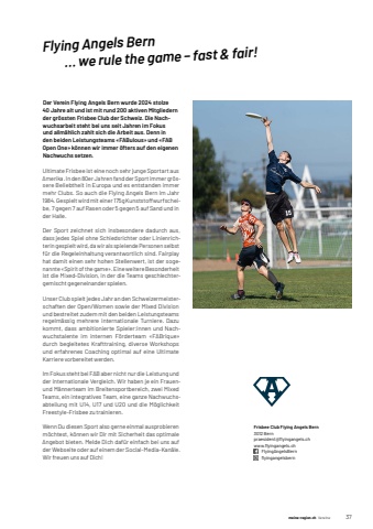 meine-region.ch meine-region.ch Vereine 371Flying Angels Bern %u2026 we rule the game %u2013 fast & fair!Der Verein Flying Angels Bern wurde 2024 stolze 40 Jahre alt und ist mit rund 200 aktiven Mitgliedern der gr%u00f6ssten Frisbee Club der Schweiz. Die Nachwuchsarbeit steht bei uns seit Jahren im Fokus und allm%u00e4hlich zahlt sich die Arbeit aus. Denn in den beiden Leistungsteams %u00abFABulous%u00bb und %u00abFAB Open One%u00bb k%u00f6nnen wir immer %u00f6fters auf den eigenen Nachwuchs setzen.Ultimate Frisbee ist eine noch sehr junge Sportart aus Amerika. In den 80er Jahren fand der Sport immer gr%u00f6ssere Beliebtheit in Europa und es entstanden immer mehr Clubs. So auch die Flying Angels Bern im Jahr 1984. Gespielt wird mit einer 175g Kunststoffwurfscheibe, 7 gegen 7 auf Rasen oder 5 gegen 5 auf Sand und in der Halle.Der Sport zeichnet sich insbesondere dadurch aus, dass jedes Spiel ohne Schiedsrichter oder Linienrichterin gespielt wird, da wir als spielende Personen selbst f%u00fcr die Regeleinhaltung verantwortlich sind. Fairplay hat damit einen sehr hohen Stellenwert, ist der sogenannte %u00abSpirit of the game%u00bb. Eine weitere Besonderheit ist die Mixed-Division, in der die Teams geschlechtergemischt gegeneinander spielen.Unser Club spielt jedes Jahr an den Schweizermeisterschaften der Open/Women sowie der Mixed Division und bestreitet zudem mit den beiden Leistungsteams regelm%u00e4ssig mehrere internationale Turniere. Dazu kommt, dass ambitionierte Spieler:innen und Nachwuchstalente im internen F%u00f6rderteam %u00abFABrique%u00bb durch begleitetes Krafttraining, diverse Workshops und erfahrenes Coaching optimal auf eine Ultimate Karriere vorbereitet werden.Im Fokus steht bei FAB aber nicht nur die Leistung und der internationale Vergleich. Wir haben je ein Frauenund M%u00e4nnerteam im Breitensportbereich, zwei Mixed Teams, ein integratives Team, eine ganze Nachwuchsabteilung mit U14, U17 und U20 und die M%u00f6glichkeit Freestyle-Frisbee zu trainieren.Wenn Du diesen Sport also gerne einmal ausprobieren m%u00f6chtest, k%u00f6nnen wir Dir mit Sicherheit das optimale Angebot bieten. Melde Dich daf%u00fcr einfach bei uns auf der Webseite oder auf einem der Social-Media-Kan%u00e4le. Wir freuen uns auf Dich!Frisbee Club Flying Angels Bern3012 Bernpraesident@fl%u0009yingangels.chwww.fl%u0009yingangels.ch FlyingAngelsBern%u0009%u0009%u0009%u0009%u0009%u0009%u0009%u0009fl%u0009yingangelsbern