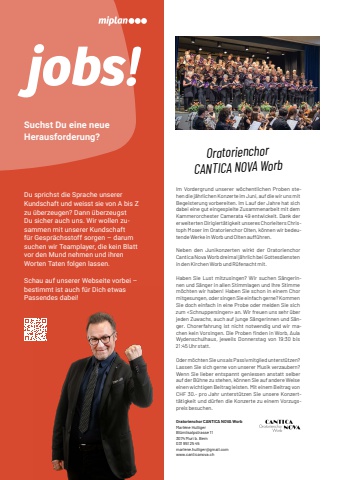 403 meine-region.ch meine-region.ch Vereine Teaser VreineOratorienchor CANTICA NOVA Worb Im Vordergrund unserer w%u00f6chentlichen Proben stehen die j%u00e4hrlichen Konzerte im Juni, auf die wir uns mit Begeisterung vorbereiten. Im Lauf der Jahre hat sich dabei eine gut eingespielte Zusammenarbeit mit dem Kammerorchester Camerata 49 entwickelt. Dank der erweiterten Dirigiert%u00e4tigkeit unseres Chorleiters Christoph Moser im Oratorienchor Olten, k%u00f6nnen wir bedeutende Werke in Worb und Olten auff%u00fchren.Neben den Junikonzerten wirkt der Oratorienchor Cantica Nova Worb dreimal j%u00e4hrlich bei Gottesdiensten in den Kirchen Worb und R%u00fcfenacht mit. Haben Sie Lust mitzusingen? Wir suchen S%u00e4ngerinnen und S%u00e4nger in allen Stimmlagen und Ihre Stimme m%u00f6chten wir haben! Haben Sie schon in einem Chor mitgesungen, oder singen Sie einfach gerne? Kommen Sie doch einfach in eine Probe oder melden Sie sich zum %u00abSchnuppersingen%u00bb an. Wir freuen uns sehr %u00fcber jeden Zuwachs, auch auf junge S%u00e4ngerinnen und S%u00e4nger. Chorerfahrung ist nicht notwendig und wir machen kein Vorsingen. Die Proben fi nden in Worb, Aula Wydenschulhaus, jeweils Donnerstag von 19:30 bis 21:45 Uhr statt.Oder m%u00f6chten Sie uns als Passivmitglied unterst%u00fctzen? Lassen Sie sich gerne von unserer Musik verzaubern? Wenn Sie lieber entspannt geniessen anstatt selber auf der B%u00fchne zu stehen, k%u00f6nnen Sie auf andere Weise einen wichtigen Beitrag leisten. Mit einem Beitrag von CHF 30.- pro Jahr unterst%u00fctzen Sie unsere Konzertt%u00e4tigkeit und d%u00fcrfen die Konzerte zu einem Vorzugspreis besuchen.Oratorienchor CANTICA NOVA WorbMarl%u00e8ne%u0009HulligerBl%u00fcmlisalpstrasse 113074 Muri b. Bern031 951 25 45marlene.hulliger@gmail.comwww.canticanova.chInserat halbseitig, 101 x 297 mmDu sprichst die Sprache unserer Kundschaft und weisst sie von A bis Z zu %u00fcberzeugen? Dann %u00fcberzeugst Du sicher auch uns. Wir wollen zusammen mit unserer Kundschaft f%u00fcr Gespr%u00e4chsstoff sorgen %u2013 darum suchen wir Teamplayer, die kein Blatt vor den Mund nehmen und ihren Worten Taten folgen lassen.Schau auf unserer Webseite vorbei %u2013 bestimmt ist auch f%u00fcr Dich etwas Passendes dabei!jobs!Suchst Du eine neue Herausforderung?