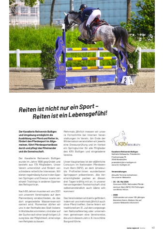 meine-region.ch meine-region.ch Vereine 431Reiten ist nicht nur ein Sport %u2013 Reiten ist ein Lebensgef%u00fchl!Der Kavallerie Reitverein Bolligen und Umgebung erm%u00f6glicht die Ausbildung von Pferd und Reiter:in, f%u00f6rdert den Pferdesport im Allgemeinen, f%u00fchrt Pferdesportanl%u00e4sse durch und pfl egt das Miteinander und die Gemeinschaft.Der Kavallerie Reitverein Bolligen wurde im Jahre 1896 gegr%u00fcndet und besteht aus 179 Mitgliedern. Unser Verein unterst%u00fctzt und f%u00f6rdert verschiedene reiterliche Interessen. Wir bieten regelm%u00e4ssig Kurse in den Sparten Springen und Dressur sowie vereinzelt Trainings in anderen Sparten des Reitsports an. Nach 66 Jahren mussten wir uns 2021 von unserem Vereinsplatz auf dem Mannenberg verabschieden, da das dort angesiedelte Wasserreservoir saniert wird. Momentan d%u00fcrfen wir uns in der Reithalle des Stall Holzers in Worblaufen einmieten, sind aber auf der Suche nach einer langfristigen L%u00f6sung bzw. der M%u00f6glichkeit, einen eigenen Reitplatz zu bauen.Mehrmals j%u00e4hrlich messen wir unsere Fortschritte bei internen Veranstaltungen im Verein. Am Ende der Wintersaison veranstalten wir jeweils eine Dressurpr%u00fcfung und im Herbst ein Springturnier f%u00fcr alle Mitglieder des KRV Bolligen und eingeladene Vereine.Unser Hauptanlass ist der allj%u00e4hrliche Concours im Nationalen Pferdezentrum Bern (NPZ), an dem Amateurbis Profi reiter:innen wunderbaren Springsport pr%u00e4sentieren. Alle Vereinsmitglieder packen an diesen drei Tagen kr%u00e4ftig mit an. In unserer hervorragenden Festwirtschaft sind selbstverst%u00e4ndlich auch G%u00e4ste willkommen!Das Vereinsleben wird aktiv gef%u00f6rdert, indem wir uns mehrmals j%u00e4hrlich auch ohne Pferd treffen. Gerne feiern wir traditionell am 31. Juli den vorgezogenen Nationalfeiertag oder unternehmen gemeinsam eine Vereinsreise, die uns in diesem Jahr z. B. ins sch%u00f6ne Burgund f%u00fchrte.Kavallerie Reitverein BolligenNathalie%u0009Dellasanta,%u0009Pr%u00e4sidentinFischrainweg 753048%u0009Worblaufenpraesident@krv-bolligen.chwww.krv-bolligen.chVeranstaltungenAktuelle Termine entnehmen Sie%u0009unserer%u0009Webseite.%u2022 23. - 25. Mai 2025Concours%u00092025,%u0009Nationales%u0009Pferdezentrum%u0009Bern%u0009(NPZ).%u0009Mit%u0009Pr%u00fcfungen%u0009von 85 bis 140cm.%u2022 20262026%u0009werden%u0009wir%u0009unser%u0009130-j%u00e4hriges%u0009Bestehen feiern. Bleiben Sie auf unserer%u0009Webseite%u0009informiert!