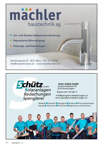 48 meine-region.ch Vereine Um- und Neubau Badezimmer-Sanierung Reparaturen Rohrreinigung Heizungs- und SolaranlagenGerberngasse 23 %u00b7 3011 Bern %u00b7 031 311 52 52info@maechler-bern.ch %u00b7 www.maechler-bern.ch