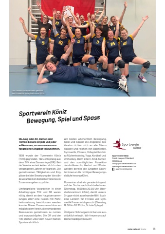 meine-region.ch meine-region.ch Vereine 551Das Damen-Volleyballteam gewinnt das Schweizer Volleyballturnier 2024Sportverein K%u00f6niz Bewegung, Spiel und SpassOb Jung oder Alt, Damen oder Herren: bei uns ist jede und jeder willkommen, um an unserem umfangreichen Angebot teilzunehmen.1908 wurde der Turnverein K%u00f6niz (TVK) gegr%u00fcndet. 1924 entsprang aus dem TVK eine Damenriege (DR). Beide Vereine entwickelten sich in den vergangenen Jahren erfolgreich. Die gemeinsamen T%u00e4tigkeiten und Engp%u00e4sse bei der Besetzung der Vorst%u00e4nde veranlassten die beiden Vereine ein Zusammengehen zu pr%u00fcfen.Umfangreiche Vorarbeiten in einer Arbeitsgruppe TVK und DR waren n%u00f6tig, damit an den Hauptversammlungen 2007 eine Fusion mit Mehrheitsmeinung beschlossen werden konnte. Dieser Zusammenschluss erm%u00f6glicht dem Verein, die vorhandenen Ressourcen gemeinsam zu nutzen und auszusch%u00f6pfen. Die DR und der TVK starten unter dem neuen Namen Sportverein K%u00f6niz.Wir bieten w%u00f6chentlich Bewegung, Spiel und Spass! Die Angebote des Vereins richten sich an alle Altersklassen und reichen von Badminton, Gymnastik, Fitness, Volleyball bis hin zu R%u00fcckentraining, Yoga, Korbball und Unihockey. Beim Eltern-Kind-Turnen und den sonnt%u00e4glichen Purzelkinder-Anl%u00e4ssen im Herbst und Winter werden bereits die j%u00fcngsten Sportler:innen an die richtigen Bewegungsabl%u00e4ufe herangef%u00fchrt.Momentan sind wir gerade dringend auf der Suche nach Korbballerinnen (Dienstag, 19.00 bis 20.30 Uhr, Oberstufenzentrum K%u00f6niz), damit unsere Gruppe nicht auseinanderf%u00e4llt! Auch eine Leiterin f%u00fcr Fitness und Gymnastik Frauen wird gesucht (Dienstag, 19.00 bis 20.30 Uhr, Schule Spiegel).%u00dcbrigens: Schnuppern ist bei uns ausdr%u00fccklich erlaubt. Wir freuen uns auf Deinen baldigen Besuch!Sportverein K%u00f6nizFrank Heepen Pr%u00e4sident3098%u0009K%u00f6nizinfo@sportvereinkoeniz.chwww.sportvereinkoeniz.ch sportvereinkoeniz