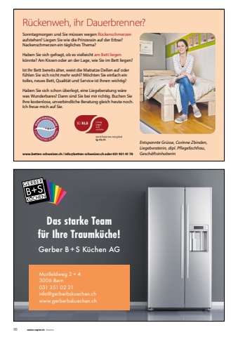 66 meine-region.ch Vereine Murifeldweg 2 + 43006 Bern031 351 02 21info@gerberbskuechen.chwww.gerberbskuechen.chDas starke Team f%u00fcr Ihre Traumk%u00fcche!Gerber B + S K%u00fcchen AGR%u00fcckenweh, ihr Dauerbrenner?Sonntagmorgen und Sie m%u00fcssen wegen R%u00fcckenschmerzenaufstehen? Liegen Sie wie die Prinzessin auf der Erbse? Nackenschmerzen ein t%u00e4gliches Thema?Haben Sie sich gefragt, ob es vielleicht am Bett liegen k%u00f6nnte? Am Kissen oder an der Lage, wie Sie im Bett liegen?Ist Ihr Bett bereits %u00e4lter, weist die Matratze Dellen auf oder f%u00fchlen Sie sich nicht mehr wohl? M%u00f6chten Sie einfach ein tolles, neues Bett, Qualit%u00e4t und Service ist Ihnen wichtig?Haben Sie sich schon %u00fcberlegt, eine Liegeberatung w%u00e4re was Wunderbares? Dann sind Sie bei mir richtig. Buchen Sie Ihre kostenlose, unverbindliche Beratung gleich heute noch. Ich freue mich auf Sie.www.betten-schweizer.ch / info@betten-schweizer.ch oder 031 931 41 70Entspannte Gr%u00fcsse, Corinne Zbinden, Liegeberaterin, dipl. Pflegefachfrau, Gesch%u00e4ftsinhaberin