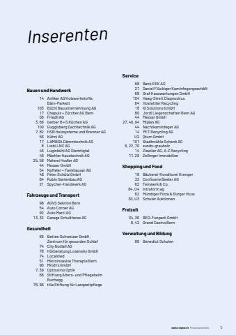 meine-region.ch Firmenverzeichnis 5Bauen und Handwerk%u0009 14%u0009 Anliker AG Holzwerkstoffe, B%u00e4rn-Parkett%u0009 103%u0009 B%u00fcchi Bauunternehmung AG%u0009 17%u0009 Chapuis + Z%u00fcrcher AG Bern%u0009 56%u0009 Friedli AG%u0009 3, 66%u0009 Gerber B+S K%u00fcchen AG%u0009 100%u0009 Guggisberg Dachtechnik AG%u0009 7, 82%u0009 HSB Heizsysteme und Brenner AG%u0009 56%u0009 K%u00fchni AG%u0009 17%u0009 LAMBDA D%u00e4mmtechnik AG%u0009 8%u0009 Liebi LNC AG%u0009 46%u0009 Luginb%u00fchl AG Diemtigtal%u0009 48%u0009 M%u00e4chler Haustechnik AG%u0009 25, 58%u0009 Malerei Hodler AG%u0009 44%u0009 Messer GmbH%u0009 54%u0009 Nyffeler + Fankhauser AG%u0009 48%u0009 Peter Sch%u00fctz GmbH%u0009 64%u0009 Rubin Gartenbau AG%u0009 21%u0009 Spycher-Handwerk AGFahrzeuge und Transport%u0009 98%u0009 AGVS Sektion Bern%u0009 54%u0009 Auto Corner AG%u0009 92%u0009 Auto Marti AG%u0009 13, 32%u0009 Garage Schultheiss AGGesundheit%u0009 66%u0009 Betten Schweizer GmbH,%u0009 %u0009 Zentrum f%u00fcr gesunden Schlaf%u0009 74%u0009 City Notfall AG%u0009 78%u0009 H%u00f6rberatung Losensky GmbH%u0009 74%u0009 Localmed%u0009 51%u0009 Mikroinvasive Therapie Bern%u0009 90%u0009 Mind%u2019rs GmbH%u0009 7, 39%u0009 Optissimo Optik%u0009 68%u0009 Stiftung Alters- und Pflegeheim Buchegg%u0009 76, 96%u0009 tilia Stiftung f%u00fcr LangzeitpflegeService%u0009 88%u0009 Bank EEK AG%u0009 21%u0009 Daniel Fl%u00fcckiger Kaminfegergesch%u00e4ft%u0009 68%u0009 Graf Hauswartungen GmbH%u0009 104%u0009 Haag-Streit Diagnostics%u0009 64%u0009 Hostettler Recycling%u0009 18%u0009 IQ Solutions GmbH%u0009 80%u0009 Jordi Liegenschaften Bern AG%u0009 44%u0009 Messer GmbH%u000927, 40, 94%u0009 Miplan AG%u0009 44%u0009 Nachtkaminfeger AG%u0009 14 %u0009 PET Recycling AG%u0009 U2%u0009 Qturn GmbH%u0009 101%u0009 Stadtm%u00fchle Schenk AG%u0009 6, 22, 70%u0009 xunds-grauholz%u0009 14%u0009 Ziswiler AG, A-Z Recycling%u0009 11, 29%u0009 ZollingerImmobilienShopping und Food%u0009 18%u0009 B%u00e4ckerei-Konditorei Krenger%u0009 32%u0009 Confiserie Beeler AG%u0009 62%u0009 Feinwerk & Co.%u0009 84, U4%u0009 intraform ag%u0009 62%u0009 Mundiger Pizza & Burger Huus%u0009 30, U3%u0009 Schuler AuktionenFreizeit%u0009 34, 36%u0009 BEO-Funpark GmbH%u0009 6, 42%u0009 Grand Casino BernVerwaltung und Bildung%u0009 86%u0009 Benedict SchulenInserenten