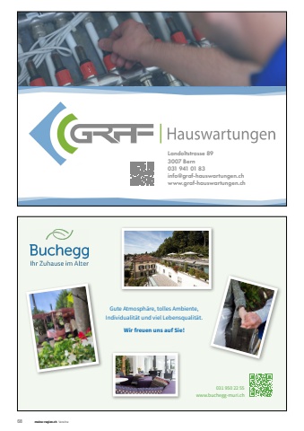 68 meine-region.ch VereineLandoltstrasse 893007 Bern031 941 01 83info@graf-hauswartungen.chwww.graf-hauswartungen.chGute Atmosph%u00e4re, tolles Ambiente, Individualit%u00e4t und viel Lebensqualit%u00e4t.Wir freuen uns auf Sie!031 950 22 55www.buchegg-muri.ch