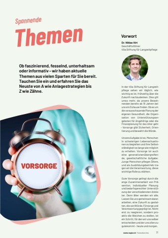 meine-region.ch meine-region.ch Themenberichte 71ThemenOb faszinierend, fesselnd, unterhaltsam oder informativ %u2013 wir haben aktuelle Themen aus vielen Sparten f%u00fcr Sie bereit. Tauchen Sie ein und erfahren Sie das Neuste von A wie Anlagestrategien bis Z wie Z%u00e4hne. SpannendeVorwortDr. Niklas HirtGesch%u00e4ftsf%u00fchrer tilia Stiftung f%u00fcr Langzeitpfl egeIn der tilia Stiftung f%u00fcr Langzeitpfl ege sehen wir t%u00e4glich, wie wichtig es ist, fr%u00fchzeitig %u00fcber die Zukunft nachzudenken. Dies gilt umso mehr, da unsere Bewohnenden bereits ab 18 Jahren bei uns ein Zuhause fi nden. Ob es um die vorausschauende Planung der eigenen Gesundheit, die Organisation von Unterst%u00fctzungsangeboten f%u00fcr Angeh%u00f6rige oder die Finanzplanung f%u00fcr das Alter geht %u2013 Vorsorge gibt Sicherheit, Orientierung und bewahrt die W%u00fcrde.Unsere Aufgabe ist es, Menschen in schwierigen Lebenssituationen zu begleiten und ihre Selbstst%u00e4ndigkeit so lange wie m%u00f6glich zu erhalten. Vorsorge ist auch eine generationen%u00fcbergreifende, gesellschaftliche Aufgabe:Junge Menschen pfl egen %u00c4ltere, und als Ausbildungsbetrieb tragen wir die Verantwortung, diese wichtige Rolle zu st%u00e4rken.Gute Vorsorge gelingt durch die enge Zusammenarbeit von Pr%u00e4vention, individueller Planung und bedarfsgerechter Unterst%u00fctzung der verschiedensten Anbieter. Denn %u00e4lter werden wir alle. Lassen Sie uns gemeinsam daran arbeiten, eine Zukunft zu gestalten, die von W%u00fcrde, F%u00fcrsorge und Verantwortung gepr%u00e4gt ist. Nicht erst zu reagieren, sondern proaktiv die Weichen zu stellen, ist ein Schritt, f%u00fcr den wir uns selber entscheiden und der uns allen zugutekommt %u2013 heute und morgen.