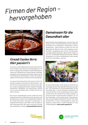 61 meine-region.ch meine-region.ch Kurzfirmenportr%u00e4ts Kurzfi rmenportr%u00e4tsFirmen der Region %u2013 hervorgehobenGemeinsam f%u00fcr die Gesundheit allerDas Schweizer Gesundheitswesen ist in der Krise. Die Kosten und der Fachkr%u00e4ftemangel nehmen stetig zu. Die Medizin ist zu spezialisiert, fragmentiert und kostenfokussiert. Jede Institution schaut f%u00fcr sich und dabei geht der Mensch immer mehr vergessen, sei es als Patient, Angeh%u00f6rige oder als Profi . Die bisherigen L%u00f6sungen bleiben St%u00fcckwerk, daher fordern Expert:innen eine notwendige Neuausrichtung des Gesundheitswesens mit einem tiefgreifenden Kulturwandel. Das sch%u00fcrt neue %u00c4ngste - was tun? Die Gesundheitsregion xunds-grauholz will die Grundversorgung als Kern des Gesundheitswesens neu denken. %u00abWir entwickeln ein Versorgungsmodell %u2039f%u00fcr die Gesundheit aller%u203a in einem Dialog auf Augenh%u00f6he zwischen den Patient:innen als Spezialisten ihres Lebens und den Profi s als Fachleute f%u00fcr moderne Medizin. In vertrauensvoller Zusammenarbeit gestalten wir mit den Gemeinden und Versicherungen interprofessionelle und partizipative Netzwerke mit dem Ziel, dass die Menschen in hoher Lebensqualit%u00e4t so lange wie m%u00f6glich zu Hause leben%u00bb, erkl%u00e4rt Pr%u00e4sident Dr. med. Michael Deppeler. www.xunds-grauholz.chGrand Casino Bern: Hier passiert%u2019s Im Herzen von Bern l%u00e4dt das Grand Casino Bern Dich zu einem Erlebnis voller Spannung und Spielspass ein. Mit einem umfangreichen Angebot von %u00fcber 295 Spielautomaten und 13 Spieltischen, inklusive Deinen Lieblingen wie Black Jack und American Roulette, bieten wir Dir Unterhaltung der Spitzenklasse. Unsere 20 Jackpots steigern die Aufregung und bieten Dir Nervenkitzel pur. In unserer Crazy Daisy Kitchen Bar kannst Du Dich mit erlesenen Speisen und Snacks verw%u00f6hnen lassen %u2013 perfekt f%u00fcr eine entspannende Pause zwischen den Spielen. Unsere aussergew%u00f6hnlichen Erlebnis-Packages kombinieren Spielspass und kulinarischen Genuss f%u00fcr ein rundum perfektes Casino-Erlebnis f%u00fcr Dich und Deine Freunde. Bei unseren regelm%u00e4ssigen Events erlebst Du einzigartige Momente der Unterhaltung, des Genusses und der Spannung. Lass Dich vom einzigartigen Ambiente des Grand Casino Bern verzaubern und geniesse unvergessliche Stunden in einer Welt, in der sich alles um Dein Vergn%u00fcgen dreht. Wir freuen uns darauf, Dich bald bei uns begr%u00fcssen zu d%u00fcrfen. www.grandcasino-bern.ch