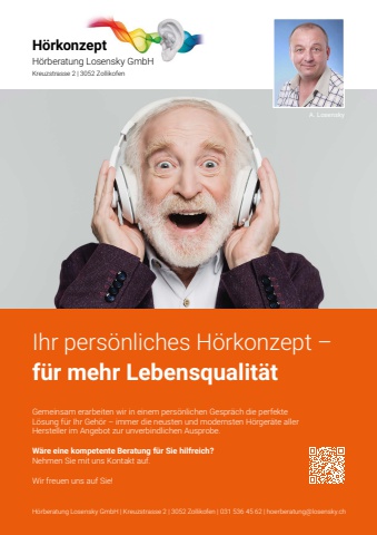 78 meine-region.ch ThemenberichteIhr pers%u00f6nliches H%u00f6rkonzept %u2013f%u00fcr mehr Lebensqualit%u00e4tGemeinsam erarbeiten wir in einem pers%u00f6nlichen Gespr%u00e4ch die perfekte L%u00f6sung f%u00fcr Ihr Geh%u00f6r %u2013 immer die neusten und modernsten H%u00f6rger%u00e4te aller Hersteller im Angebot zur unverbindlichen Ausprobe.W%u00e4re eine kompetente Beratung f%u00fcr Sie hilfreich?Nehmen Sie mit uns Kontakt auf. Wir freuen uns auf Sie!H%u00f6rberatung Losensky GmbH | Kreuzstrasse 2 | 3052 Zollikofen | 031 536 45 62 | hoerberatung@losensky.chKreuzstrasse 2 | 3052 ZollikofenA. LosenskyH%u00f6rberatung Losensky GmbHH%u00f6rkonzept