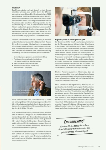 meine-region.ch meine-region.ch Themenberichte 798Wie bitte?Das Ohr verarbeitet mehr als doppelt so viele Sinneseindr%u00fccke wie das Auge und ist damit der differenzierteste unserer Sinne. Die H%u00f6rschnecke kann 7000 verschiedene Tonh%u00f6hen auseinanderhalten. Ein H%u00f6rverlust erschwert also schnell die unterschiedlichsten Bereiche des Lebens. Die Pfl ege sozialer Kontakte im Privatleben oder berufl iche Meetings werden zur Herausforderung. Das kann zu einer sozialen Isolierung f%u00fchren, wodurch ein grosses St%u00fcck der Lebensqualit%u00e4t verloren geht. Aktuelle Studien zeigen sogar einen Zusammenhang zwischen unversorgtem H%u00f6rverlust, H%u00f6ranstrengung und der geistigen Fitness %u2013 wo wir dann auch wieder bei der psychischen Gesundheit w%u00e4ren. Es lohnt sich deshalb auch hier vorzeitig zu handeln und sich bei bemerkbaren H%u00f6rsch%u00e4den an Hals-NasenOhren-%u00c4rzt:innen oder H%u00f6rakustiker:innen zu wenden.H%u00f6rsch%u00e4den entwickeln sich meist langsam, k%u00f6nnen aber schwerwiegende Folgen haben. Bereits durch relativ einfache Massnahmen kann eine H%u00f6rminderung vorgebeugt und die Ohren k%u00f6nnen gesch%u00fctzt werden:%u2022 Vermeidung von grossen Lautst%u00e4rken im Alltag%u2022 Festlegen einer maximalen Lautst%u00e4rke, z. B. beim Musikh%u00f6ren oder Fernsehen %u2022 Kauf von ger%u00e4uscharmen Ger%u00e4ten%u2022 Vermeidung von langer Aussetzung bei erh%u00f6htem L%u00e4rmpegelDie%u0009heutige%u0009Technik%u0009erm%u00f6glicht%u0009es,%u0009trotz%u0009H%u00f6rschaden%u0009wieder%u0009besser%u0009h%u00f6ren%u0009zu%u0009k%u00f6nnen.Erschreckend!Ab dem 70. Lebensjahr haben %u00fcber 50% aller Menschen ein ein,geschr%u00e4nktes H%u00f6rverm%u00f6gen.Augen auf, wenn es ums Augenlicht geht!Der Sehsinn stellt f%u00fcr viele Menschen den wichtigsten der f%u00fcnf Sinne dar, denn er hilft uns bei der Orientierung in der Umwelt, zur Positionierung im Raum, zur Erkennung von Dingen sowie Personen und bereichert das Leben durch die visuelle Farben- und Formenvielfalt. Beim Sehsinn handelt es sich um ein komplexes Zusammenspiel von physiologischen und neurologischen Prozessen, welche sich vom Auge ausgehend bis ins Gehirn und als Feedback wieder zur%u00fcck zu den Augen erstreckt. Aufgrund der Komplexit%u00e4t des ganzen Systems ist es entsprechend anf%u00e4llig auf St%u00f6rungen %u2013 beziehungsweise es kommen mehrere Ursachen und Strukturen f%u00fcr potenzielle St%u00f6rungen in Frage. All diese Faktoren zusammen f%u00fchren dazu, dass ab einem gewissen Alter eine regelm%u00e4ssige Kontrolle des ganzen Systemkomplexes erfolgen sollte, um weiterhin einen reibungslosen Ablauf (ein voll intaktes Sehverm%u00f6gen) sicherstellen zu k%u00f6nnen.Ab 40 Jahren wird die regelm%u00e4ssige Messung des Augendrucks und die Untersuchung der Netzhaut empfohlen. So kann beispielsweise der Gr%u00fcne Star (Glaukom) erkannt und einer Verschlechterung der Situation vorgebeugt werden. Eine regelm%u00e4ssige Makula-Untersuchung wird ab dem 60. Lebensjahr empfohlen. Im Alter kommt es oft zu degenerativen Ver%u00e4nderungen der Makula, was einen direkten Einfl uss auf das Sehverm%u00f6gen hat. Oft handelt es sich dabei um einen schleichenden Prozess. Wird dieser fr%u00fch genug erkannt und ad%u00e4quat reagiert, kann eine Makula-Degeneration relativ gut und erfolgreich behandelt werden.Wenn sich der L%u00e4rm nicht vermeiden l%u00e4sst, so sollte ein leistungsf%u00e4higer H%u00f6rschutz getragen werden. Ein L%u00e4rmh%u00f6rschaden entwickelt sich in den ersten zehn Jahren einer ungesch%u00fctzten L%u00e4rmexposition. Das kann bereits ab 60 dB der Fall sein. Eine Mittelohrentz%u00fcndung, die nicht richtig ausheilt, oder zu intensive Ohrhygiene mit Wattest%u00e4bchen k%u00f6nnen der Gesundheit des Ohres ebenfalls zusetzen. Daher: Wenn das Ohr schmerzt, man nur noch ged%u00e4mpft h%u00f6rt oder in Sachen Geh%u00f6r andere Einschr%u00e4nkungen sp%u00fcrt, sollte ein HNO-Arzt aufgesucht werden. Denn mit der richtigen, fr%u00fchzeitigen Behandlung werden einige H%u00f6rprobleme wirksam vorgebeugt.Ein altersbedingter H%u00f6rverlust f%u00e4llt meist zun%u00e4chst dem Umfeld auf. Unabh%u00e4ngig vom Feedback anderer schadet es aber nicht, erste Anzeichen selbst aktiv wahrzunehmen, z. B. bei der Lautst%u00e4rkeregelung oder durch einen Tinnitus.