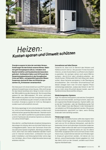 meine-region.ch meine-region.ch Themenberichte 831 Heizen:Kosten sparen und Umwelt sch%u00fctzenEnergie zu sparen ist eine der zentralen Herausforderungen f%u00fcr den Schutz unseres Klimas. Nat%u00fcrlich geht Energiesparen alle an, trotzdem sind Bauherrschaften und Hausbesitzende besonders gefordert. Schliesslich fallen rund 40 Prozent des Gesamtenergieverbrauchs in der Europ%u00e4ischen Union auf Wohn- und gewerblich genutzte H%u00e4user. Zusammen sind sie f%u00fcr %u00fcber ein Drittel der gesamten CO2-Emissionen verantwortlich.Die Heizung ist mit einem Anteil von rund 75 Prozent der gr%u00f6sste Energiefresser eines Hauses. Wie viel Energie f%u00fcr das Heizen ben%u00f6tigt wird, h%u00e4ngt in erster Linie von der W%u00e4rmed%u00e4mmung des Hauses ab. Sie ist ausschlaggebend f%u00fcr den W%u00e4rmebedarf. Mit einer optimalen W%u00e4rmed%u00e4mmung l%u00e4sst sich der Energieverbrauch und damit auch die Belastung der Umwelt um %u00fcber die H%u00e4lfte senken. Energie zu sparen ist nicht nur %u00f6kologisch, sondern auch wirtschaftlich sinnvoll. Die Heizungsanlage ist ein entscheidender Kostenfaktor, nicht nur beim Neubau eines Hauses, sondern auch w%u00e4hrend seiner gesamten Betriebszeit. Deshalb macht es Sinn, sich damit ausf%u00fchrlich auseinanderzusetzen und mit Fachleuten die einzelnen Systeme zu diskutieren und zu hinterfragen. Hier alle Vor- und Nachteile der einzelnen Heizsysteme darzulegen ist m%u00fcssig, denn es sind viele Faktoren ausschlaggebend daf%u00fcr, warum der Fachmann Ihnen dieses oder jenes System empfi ehlt. Allerdings schadet es nicht, wenn man sich selbst Gedanken dar%u00fcber macht und im Internet recherchiert, schliesslich hat auch jeder Installateur und Heizungstechniker seine eigenen Vorlieben, die er Ihnen m%u00f6glicherweise bevorzugt anbieten m%u00f6chte. Innovationen auf allen EbenenTatsache ist, dass sich im Bereich des Heizens und K%u00fchlens enorm viel tut. Die grossen Firmen forschen intensiv, um den Kostenfaktor so effi zient wie m%u00f6glich zu gestalten. Vor wenigen Jahren noch waren W%u00e4rmepumpen %u2013 die mit Erd- oder Luftw%u00e4rme arbeiten %u2013 absolute Exoten. Mittlerweile f%u00fchrt kein Weg mehr daran vorbei, diese Variante wenigstens in die %u00dcberlegung einzubeziehen. Den minimalen Stromverbrauch bei diesen Anlagen kann man mit einer eigenen Photovoltaikanlage abdecken, sodass das Heizen in der Folge nur mehr einen Bruchteil dessen kostet, was mit herk%u00f6mmlichen Brennstoffen n%u00f6tig ist. Niedertemperatur-SystemeEgal, f%u00fcr welches Heizsystem und welchen Energietr%u00e4ger man sich entscheidet, wichtig erscheint, dass man ein sogenanntes Niedertemperatur-System w%u00e4hlt, wie es bei der Fussboden - oder der Wandheizung der Fall ist. Denn dabei muss das Wasser in den Heizungsrohren lediglich auf 30 Grad aufgeheizt werden. Die grosse Kostenexplosion geschieht nur dann, wenn f%u00fcnfzig Grad oder mehr ben%u00f6tigt werden. F%u00f6rderungen nutzenIm Sinne des Umweltschutzes sollte das eigene Heizverhalten hinterfragt werden. Viele entscheiden sich nach wie vor f%u00fcr ein %u00e4lteres Heizsystem, weil die Einbaukosten immer noch g%u00fcnstiger sind als bei modernen Anlagen. Dabei sollte man aber auch im Auge behalten, dass irgendwann m%u00f6glicherweise ein Aus f%u00fcr %u00e4ltere Techniken ausgesprochen wird und man erneut investieren muss. Zudem k%u00f6nnen derzeit noch F%u00f6rderungen in Anspruch genommen werden, mit denen ein modernes, zukunftsweisendes Heizen gegeben ist. Und das dient nicht nur der Umwelt, sondern auch Ihrem eigenen Wohlbefi nden.