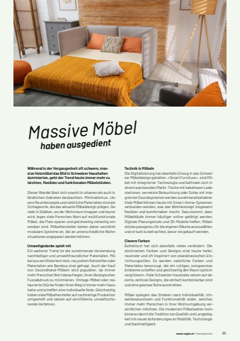 meine-region.ch meine-region.ch Themenberichte 851Massive M%u00f6bel haben ausgedientW%u00e4hrend in der Vergangenheit oft schwere, massive Holzm%u00f6bel das Bild in Schweizer Haushalten dominierten, geht der Trend heute immer mehr zu leichten, fl exiblen und funktionalen M%u00f6belst%u00fccken. Dieser Wandel l%u00e4sst sich sowohl in urbanen als auch in l%u00e4ndlichen Gebieten beobachten. Minimalismus, clevere Raumkonzepte und nat%u00fcrliche Materialien sind die Schlagworte, die das aktuelle M%u00f6beldesign pr%u00e4gen. Gerade in St%u00e4dten, wo der Wohnraum knapper und teurer wird, legen viele Menschen Wert auf multifunktionale M%u00f6bel, die Platz sparen und gleichzeitig vielseitig einsetzbar sind. M%u00f6belhersteller bieten daher verst%u00e4rkt modulare Systeme an, die an unterschiedliche Wohnsituationen angepasst werden k%u00f6nnen.Umweltgedanke spielt mitEin weiterer Trend ist die zunehmende Verwendung nachhaltiger und umweltfreundlicher Materialien. M%u00f6bel aus zertifi ziertem Holz, recycelten Rohstoffen oder Materialien wie Bambus sind gefragt. Auch der Kauf von Secondhand-M%u00f6beln wird popul%u00e4rer, da immer mehr Menschen Wert darauf legen, ihren %u00f6kologischen Fussabdruck zu minimieren. Vintage-M%u00f6bel oder restaurierte St%u00fccke fi nden ihren Weg in immer mehr Haushalte und schaffen eine individuelle Note. Gleichzeitig haben viele M%u00f6belhersteller auf nachhaltige Produktion umgestellt und setzen auf zertifi zierte, umweltschonende Verfahren.Technik in M%u00f6belnDie Digitalisierung hat ebenfalls Einzug in das Schweizer M%u00f6beldesign gehalten. %u00abSmart Furniture%u00bb, sind M%u00f6bel mit integrierter Technologie und befi nden sich in einem wachsenden Markt: Tische mit kabellosen Ladestationen, vernetzte Beleuchtung oder Sofas mit integrierten Soundsystemen werden zunehmend beliebter. Viele M%u00f6bel k%u00f6nnen heute mit Smart-Home-Systemen verbunden werden, was das Wohnkonzept insgesamt fl exibler und komfortabler macht. Dazu kommt, dass M%u00f6belk%u00e4ufe immer h%u00e4ufi ger online get%u00e4tigt werden. Digitale Planungstools und 3D-Modelle helfen, M%u00f6belst%u00fccke passgenau f%u00fcr die eigenen R%u00e4ume auszuw%u00e4hlen und virtuell zu betrachten, bevor sie gekauft werden.Clevere Farben%u00c4sthetisch hat sich ebenfalls vieles ver%u00e4ndert: Die dominanten Farben und Designs sind heute heller, neutraler und oft inspiriert von skandinavischen Einrichtungsstilen. Es werden nat%u00fcrliche Farben und Materialien bevorzugt, die ein ruhiges, entspanntes Ambiente schaffen und gleichzeitig den Raum optisch vergr%u00f6ssern. Viele Schweizer Haushalte setzen auf dezente, zeitlose Designs, die einfach kombinierbar sind und eine gewisse Ruhe ausstrahlen. M%u00f6bel spiegeln das Streben nach Individualit%u00e4t, Umweltbewusstsein und Funktionalit%u00e4t wider, welches immer mehr Menschen in ihrer Wohnumgebung verwirklichen m%u00f6chten. Die modernen M%u00f6belwelten kombinieren damit die Tradition von Qualit%u00e4t und Langlebigkeit mit neuen Anforderungen an Mobilit%u00e4t, Technologie und Nachhaltigkeit.