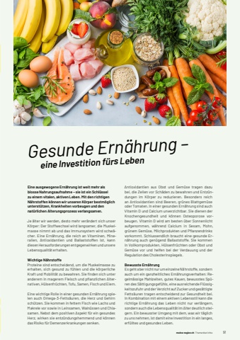 meine-region.ch meine-region.ch Themenberichte 91Gesunde Ern%u00e4hrung %u2013 eine Investition f%u00fcrs LebenEine ausgewogene Ern%u00e4hrung ist weit mehr als blosse Nahrungsaufnahme %u2013 sie ist ein Schl%u00fcssel zu einem vitalen, aktiven Leben. Mit den richtigen N%u00e4hrstoffen k%u00f6nnen wir unseren K%u00f6rper bestm%u00f6glich unterst%u00fctzen, Krankheiten vorbeugen und den nat%u00fcrlichen Alterungsprozess verlangsamen. Je %u00e4lter wir werden, desto mehr ver%u00e4ndert sich unser K%u00f6rper: Der Stoffwechsel wird langsamer, die Muskelmasse nimmt ab und das Immunsystem wird schw%u00e4cher. Eine Ern%u00e4hrung, die reich an Vitaminen, Mineralien, Antioxidantien und Ballaststoffen ist, kann diesen Herausforderungen entgegenwirken und unsere Lebensqualit%u00e4t erhalten. Wichtige N%u00e4hrstoffe Proteine sind entscheidend, um die Muskelmasse zu erhalten, sich gesund zu f%u00fchlen und die k%u00f6rperliche Kraft und Mobilit%u00e4t zu bewahren. Sie fi nden sich unter anderem in magerem Fleisch und pfl anzlichen Alternativen, H%u00fclsenfr%u00fcchten, Tofu, Samen, Fisch und Eiern.Eine wichtige Rolle in einer gesunden Ern%u00e4hrung spielen auch Omega-3-Fetts%u00e4uren, die Herz und Gehirn sch%u00fctzen. Sie kommen in fettem Fisch wie Lachs und Makrele vor sowie in Leinsamen, Waln%u00fcssen und Chiasamen. Nebst dem positiven Aspekt f%u00fcr ein gesundes Herz, wirken sie entz%u00fcndungshemmend und k%u00f6nnen das Risiko f%u00fcr Demenzerkrankungen senken.Antioxidantien aus Obst und Gem%u00fcse tragen dazu bei, die Zellen vor Sch%u00e4den zu bewahren und Entz%u00fcndungen im K%u00f6rper zu reduzieren. Besonders reich an Antioxidantien sind Beeren, gr%u00fcnes Blattgem%u00fcse oder Tomaten. In einer gesunden Ern%u00e4hrung sind auch Vitamin D und Calcium unverzichtbar. Sie dienen der Knochengesundheit und k%u00f6nnen Osteoporose vorbeugen. Vitamin D wird am besten %u00fcber Sonnenlicht aufgenommen, w%u00e4hrend Calcium in Sesam, Mohn, gr%u00fcnem Gem%u00fcse, Milchprodukten und Pfl anzendrinks vorkommt. Schlussendlich braucht eine gesunde Ern%u00e4hrung auch gen%u00fcgend Ballaststoffe. Sie kommen in Vollkornprodukten, H%u00fclsenfr%u00fcchten oder Obst und Gem%u00fcse vor und helfen bei der Verdauung und der Regulation des Cholesterinspiegels. Bewusste Ern%u00e4hrung Es geht aber nicht nur um einzelne N%u00e4hrstoffe, sondern auch um ein ganzheitliches Ern%u00e4hrungsverhalten: Regelm%u00e4ssige Mahlzeiten, gutes Kauen, bewusstes Sp%u00fcren des S%u00e4ttigungsgef%u00fchls, eine ausreichende Fl%u00fcssigkeitszufuhr und der Verzicht auf Zucker und ges%u00e4ttigte Fetts%u00e4uren tragen entscheidend zur Gesundheit bei. In Kombination mit einem aktiven Lebensstil kann die richtige Ern%u00e4hrung das Leben nicht nur verl%u00e4ngern, sondern auch die Lebensqualit%u00e4t im Alter deutlich steigern. Ein bewusster Umgang mit dem, was wir t%u00e4glich zu uns nehmen, ist damit eine Investition in ein langes, erf%u00fclltes und gesundes Leben.
