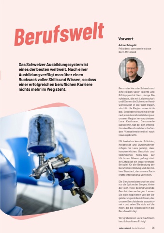 meine-region.ch meine-region.ch Aus der Berufswelt Einstiegsseiten 951VorwortAdrian BringoldPr%u00e4sident, carrosserie suisse Bern-MittellandBern %u2013 das Herz der Schweiz und eine Region voller Talente und Erfolgsgeschichten. Junge Berufsleute, die mit Leidenschaft und K%u00f6nnen die Schweizer Handwerkskunst in die Welt tragen, sind f%u00fcr die Region unverzichtbar. Besonders stolz sind wir darauf, eine Ausnahmeleistung aus unserer Region hervorzuheben:Lara Kaufmann, Carrosserielackiererin, hat bei den internationalen Berufsmeisterschaften den Vizeweltmeistertitel nach Hause gebracht.Mit beeindruckender Pr%u00e4zision, Kreativit%u00e4t und Durchhalteverm%u00f6gen hat Lara gezeigt, dass handwerkliches Geschick und technisches Know-how auf h%u00f6chstem Niveau gefragt sind. Ihr Erfolg ist ein inspirierendes Beispiel f%u00fcr die Bedeutung der berufl ichen Bildung und den hohen Standard, den unsere Fachkr%u00e4fte international vertreten.Die Berufsmeisterschaften sind nur die Spitze des Berges, hinter der sich viele beeindruckende Geschichten verbergen. Lassen Sie sich inspirieren von der Begeisterung und dem K%u00f6nnen, das unsere Berufstalente auszeichnet %u2013 und seien Sie stolz auf die Kraft, die die Region Bern in die Berufswelt tr%u00e4gt.Wir gratulieren Lara Kaufmann herzlich zu ihrem Erfolg!BerufsweltDas Schweizer Ausbildungssystem ist eines der besten weltweit. Nach einer Ausbildung verf%u00fcgt man %u00fcber einen Rucksack voller Skills und Wissen, so dass einer erfolg reichen berufl ichen Karriere nichts mehr im Weg steht.