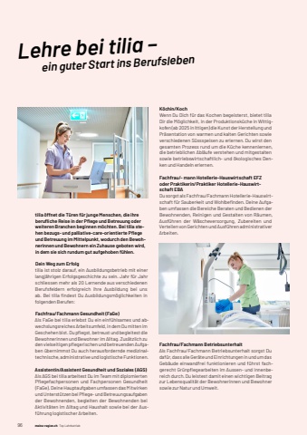 961 meine-region.ch Top LehrbetriebLehre bei tilia %u2013 ein guter Start ins Berufslebentilia %u00f6ffnet die T%u00fcren f%u00fcr junge Menschen, die ihre berufl iche Reise in der Pfl ege und Betreuung oder weiteren Branchen beginnen m%u00f6chten. Bei tilia stehen bezugs- und palliative-care-orientierte Pfl ege und Betreuung im Mittelpunkt, wodurch den Bewohnerinnen und Bewohnern ein Zuhause geboten wird, in dem sie sich rundum gut aufgehoben f%u00fchlen.Dein Weg zum Erfolgtilia ist stolz darauf, ein Ausbildungsbetrieb mit einer langj %u00e4hrigen Erfolgsgeschichte zu sein. Jahr f%u00fcr Jahr schliessen mehr als 20 Lernende aus verschiedenen Berufsfeldern erfolgreich ihre Ausbildung bei uns ab. Bei tilia fi ndest Du Ausbildungsm%u00f6glichkeiten in folgenden Berufen:Fachfrau/Fachmann Gesundheit (FaGe)Als FaGe bei tilia erlebst Du ein einf%u00fchlsames und abwechslungsreiches Arbeitsumfeld, in dem Du mitten im Geschehen bist. Du pfl egst, betreust und begleitest die Bewohnerinnen und Bewohner im Alltag. Zus%u00e4tzlich zu den vielseitigen pfl egerischen und betreuenden Aufgaben %u00fcbernimmst Du auch herausfordernde medizinaltechnische, administrative und logistische Funktionen.Assistentin/Assistent Gesundheit und Soziales (AGS)Als AGS bei tilia arbeitest Du im Team mit diplomierten Pfl egefachpersonen und Fachpersonen Gesundheit (FaGe). Deine Hauptaufgaben umfassen das Mitwirken und Unterst%u00fctzen bei Pfl ege- und Betreuungsaufgaben der Bewohnenden, begleiten der Bewohnenden bei Aktivit%u00e4ten im Alltag und Haushalt sowie bei der Ausf%u00fchrung logistischer Arbeiten.K%u00f6chin/KochWenn Du Dich f%u00fcr das Kochen begeisterst, bietet tilia Dir die M%u00f6glichkeit, in der Produktionsk%u00fcche in Wittigkofen (ab 2025 in Ittigen) die Kunst der Herstellung und Pr%u00e4sentation von warmen und kalten Gerichten sowie verschiedenen S%u00fcssspeisen zu erlernen. Du wirst den gesamten Prozess rund um die K%u00fcche kennenlernen, die betrieblichen Abl%u00e4ufe verstehen und mitgestalten sowie betriebswirtschaftlich- und %u00f6kologisches Denken und Handeln erlernen.Fachfrau/- mann Hotellerie-Hauswirtschaft EFZ oder Praktikerin/Praktiker Hotellerie-Hauswirtschaft EBADu sorgst als Fachfrau/Fachmann Hotellerie-Hauswirtschaft f%u00fcr Sauberkeit und Wohlbefi nden. Deine Aufgaben umfassen die Bereiche Beraten und Bedienen der Bewohnenden, Reinigen und Gestalten von R%u00e4umen, Ausf%u00fchren der W%u00e4scheversorgung, Zubereiten und Verteilen von Gerichten und Ausf%u00fchren administrativer Arbeiten.Fachfrau/Fachmann BetriebsunterhaltAls Fachfrau/Fachmann Betriebsunterhalt sorgst Du daf%u00fcr, dass alle Ger%u00e4te und Einrichtungen in und um das Geb%u00e4ude einwandfrei funktionieren und f%u00fchrst fachgerecht Gr%u00fcnpfl egearbeiten im Aussen- und Innenbereich durch. Du leistest damit einen wichtigen Beitrag zur Lebensqualit%u00e4t der Bewohnerinnen und Bewohner sowie zur Natur und Umwelt.
